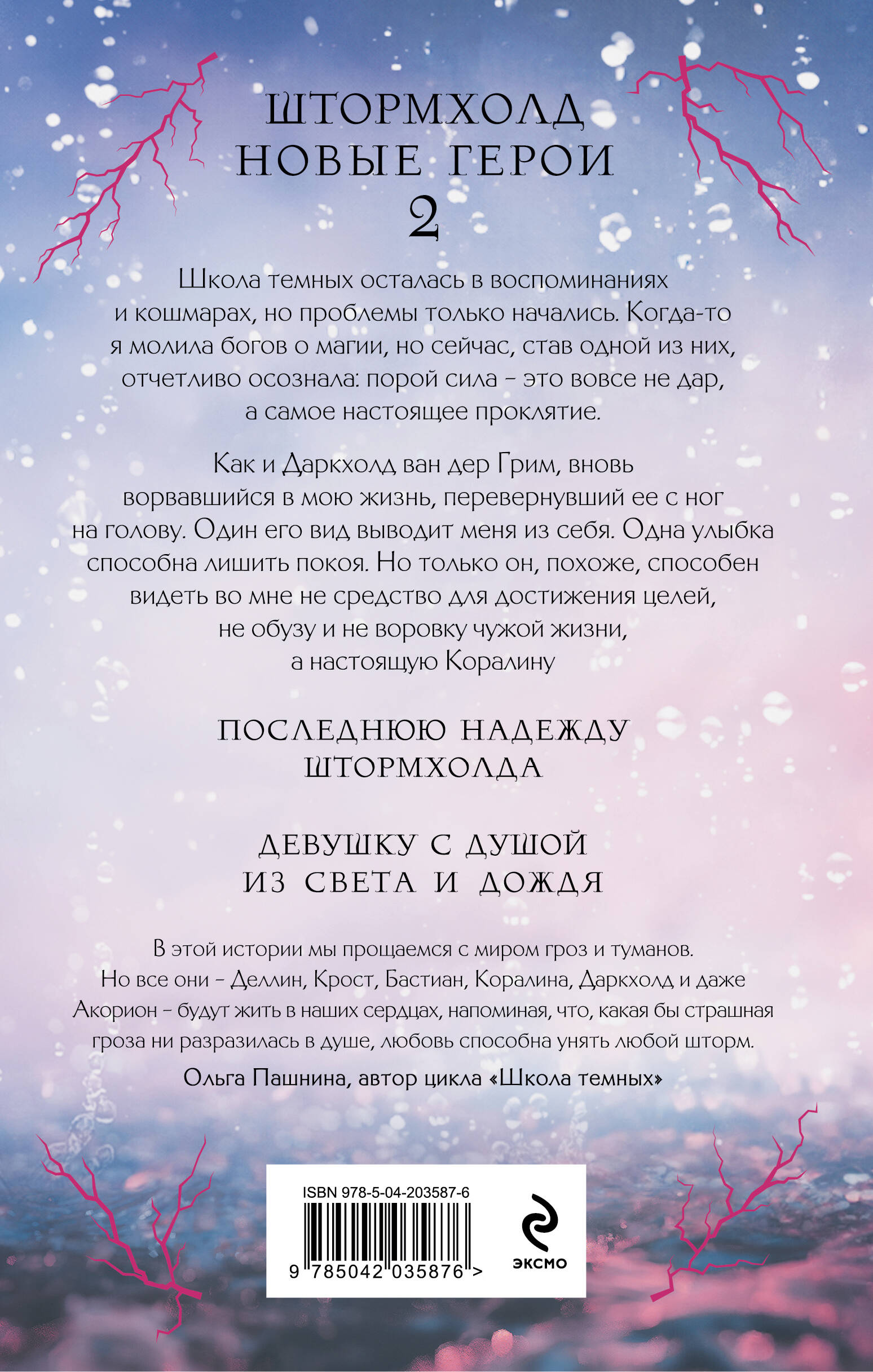 Школа темных осталась в воспоминаниях и кошмарах, но проблемы только начались. Когда-то я молила богов о магии, но сейчас, став одной из них, отчетливо осознала: порой сила - это вовсе не дар, а самое настоящее проклятие. Как и Даркхолд ван дер Грим, вновь ворвавшийся в мою жизнь, перевернувший ее с ног на голову. Один его вид выводит меня из себя. Одна улыбка способна лишить покоя. Но только он, похоже, способен видеть во мне не средство для достижения целей, не обузу и не воровку чужой жизни, а настоящую Коралину - последний шанс королевства Штормхолд, девушку с душой из света и дождя. В заключительной части цикла «Школа темных» читателя ждут: - Долгожданный финал дилогии о девушке со светлым даром и сыне темного бога. - Трогательная и пронзительная история о предназначении и любви, которая сильнее смерти. - Возвращение в мир популярного цикла «Школа темных». - Камео любимых героев: Деллин Шторм, Кеймана Кроста и других. - Эстетика снежных долин, темных замков и гроз.| Издательство | ООО "Издательство "Эксмо" |