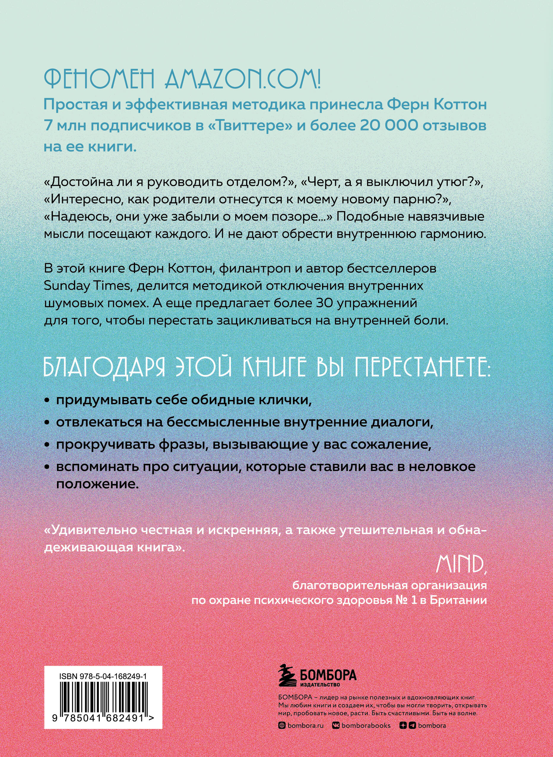 ОТ ИЗДАТЕЛЯ «Достойна ли я руководить отделом?», «Черт, а я выключил утюг?», «Интересно, как родители отнесутся к моему новому парню?», «Надеюсь, они уже забыли о моем позоре…». Подобные навязчивые мысли посещают каждого. И не дают обрести внутреннюю гармонию. В этой книге Ферн Коттон, филантроп и автор бестселлеров Sunday Times, делится методикой отключения внутренних шумовых помех. А еще предлагает более 30 упражнений для того, чтобы перестать зацикливаться на внутренней боли. Благодаря этой книге вы перестанете: - придумывать себе обидные клички; - отвлекаться на бессмысленные внутренние диалоги; - прокручивать фразы, вызывающее у вас сожаление; - вспоминать про ситуации, которые ставили вас в неловкое положение. ЦИТАТЫ «Провалы - это ключ ко всему. Без неудач мы не понимаем, что значит настоящий вызов». «Мы снова и снова возвращаемся к негативным мыслям, потому что привыкли так делать. Во множестве ситуаций вы можете использовать вместо любых негативных утверждений одно простое: "Я ДЕЛАЮ ДОСТАТОЧНО"». «Я вообще-то никогда не хочу идти на пробежку, но еще ни разу не пожалела, что пошла!» «Когда вы принимали комплимент, вы ощущали, что делаете это с позиции высокомерия либо уверенности в себе? Человек, с которым вы говорили, скорее всего, воспримет энергетику, исходившую от тех слов, а не сами формулировки». «Уверенность - это броня, позволяющая нам свободно высказываться, не беспокоясь, что подумают другие».| Издательство | ООО "Издательство "Эксмо" |