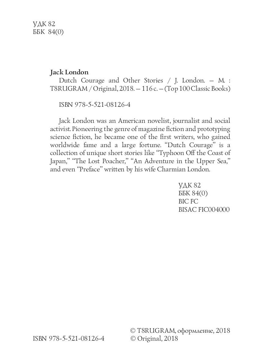 Jack London was an American novelist, journalist and social activist. Pioneering the genre of magazine fiction and prototyping science fiction, he became one of the first writers, who gained worldwide fame and a large fortune. "Dutch Courage" is a collection of unique short stories like "Typhoon Off the Coast of Japan", "The Lost Poacher", "An Adventure in the Upper Sea" and even "Preface" written by his wife Charmian London.