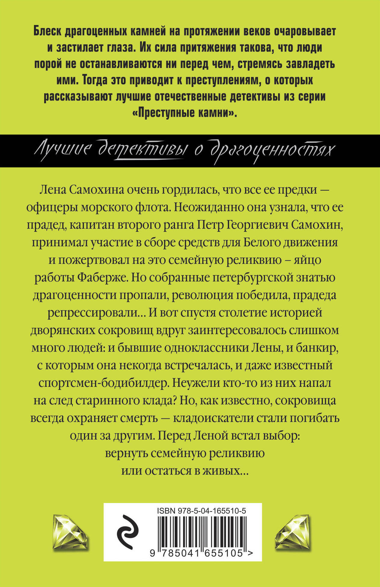Лена Самохина очень гордилась, что все ее предки - офицеры морского флота. Неожиданно она узнала, что ее прадед, капитан 2-го ранга Петр Георгиевич Самохин, принимал участие в сборе средств для Белого движения и пожертвовал на это семейную реликвию - яйцо работы Фаберже. Но собранные петербургской знатью драгоценности пропали, революция победила, прадеда репрессировали… И вот спустя столетие историей дворянских сокровищ вдруг заинтересовалось слишком много людей: и бывшие одноклассники Лены, и банкир, с которым она некогда встречалась, и даже известный спортсмен-бодибилдер. Неужели кто-то из них напал на след старинного клада? Но, как известно, сокровища всегда охраняет смерть - кладоискатели стали погибать один за другим. Перед Леной встал выбор: вернуть семейную реликвию или остаться в живых… Татьяна Устинова рекомендует: «Островская играет жизнями, тасует героев, заставляет их совершать неожиданные и странные поступки, а читателя - с замиранием сердца следить за ними и гадать: сработает, не сработает, выберутся, не выберутся!.. Сюжет то и дело поворачивает в какую-то другую сторону и на полной скорости несется дальше. Это почти невозможно, но ей удается удержаться на этих виражах!.. И очень хочется, чтобы у героев все получилось!.. И финал! Он всегда феерический, во всех отношениях».