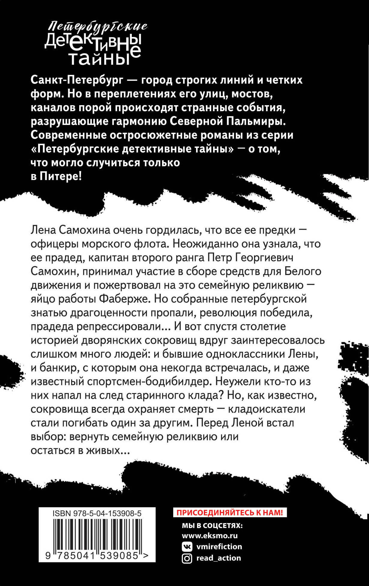 Лена Самохина очень гордилась, что все ее предки - офицеры морского флота. Неожиданно она узнала, что ее прадед, капитан второго ранга Петр Георгиевич Самохин, принимал участие в сборе средств для Белого движения и пожертвовал на это семейную реликвию - яйцо работы Фаберже. Но собранные петербургской знатью драгоценности пропали, революция победила, прадеда репрессировали… И вот спустя столетие историей дворянских сокровищ вдруг заинтересовалось слишком много людей: и бывшие одноклассники Лены, и банкир, с которым она некогда встречалась, и даже известный спортсмен-бодибилдер. Неужели кто-то из них напал на след старинного клада? Но, как известно, сокровища всегда охраняет смерть - кладоискатели стали погибать один за другим. Перед Леной встал выбор: вернуть семейную реликвию или остаться в живых… Татьяна Устинова рекомендует: «Островская играет жизнями, тасует героев, заставляет их совершать неожиданные и странные поступки, а читателя с замиранием сердца следить за ними и гадать - сработает, не сработает, выберутся, не выберутся!.. Сюжет то и дело поворачивает в какую-то другую сторону и на полной скорости несется дальше. Это почти невозможно, но ей удается удержаться на этих виражах!.. И очень хочется, чтобы у героев все получилось!.. И финал! Он всегда феерический, во всех отношениях».