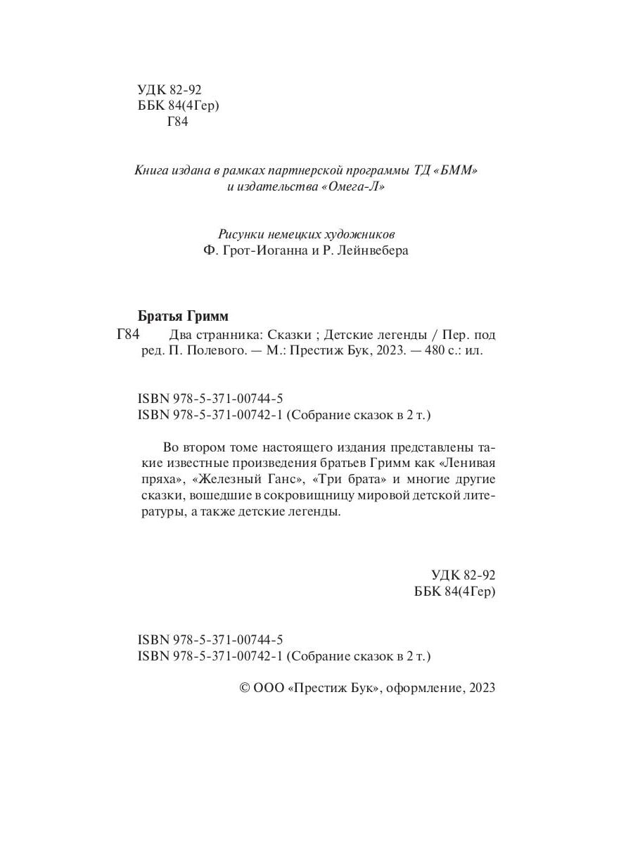 Во втором томе настоящего издания представлены такие известные произведения братьев Гримм как "Ленивая пряха", "Железный Ганс", "Три брата" и многие другие сказки, вошедшие в сокровищницу мировой детской литературы, а также детские легенды.| Издательство | Престиж Бук |