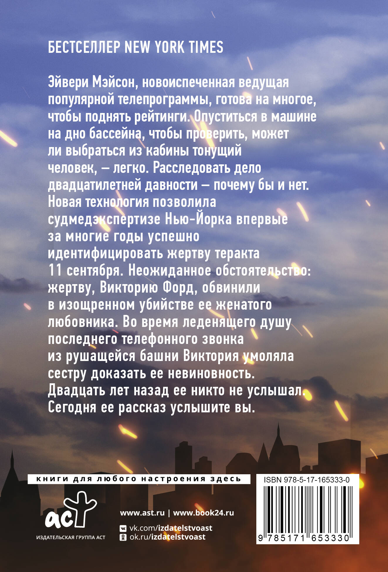 Эйвери Мэйсон, новоиспеченная ведущая популярной телепрограммы, готова на многое, чтобы поднять рейтинги. Опуститься в машине на дно бассейна, чтобы проверить, может ли выбраться из кабины тонущий человек, - легко. Расследовать дело двадцатилетней давности - почему бы и нет. Новая технология позволила судмедэкспертизе Нью-Йорка впервые за многие годы успешно идентифицировать жертву теракта 11 сентября. Неожиданное обстоятельство: жертву, Викторию Форд, обвинили в изощренном убийстве ее женатого любовника. Во время леденящего душу последнего телефонного звонка из рушащейся башни Виктория умоляла свою сестру доказать ее невиновность. Двадцать лет назад ее никто не услышал. Сегодня ее рассказ услышите вы.| Издательство | Издательство "АСТ" |