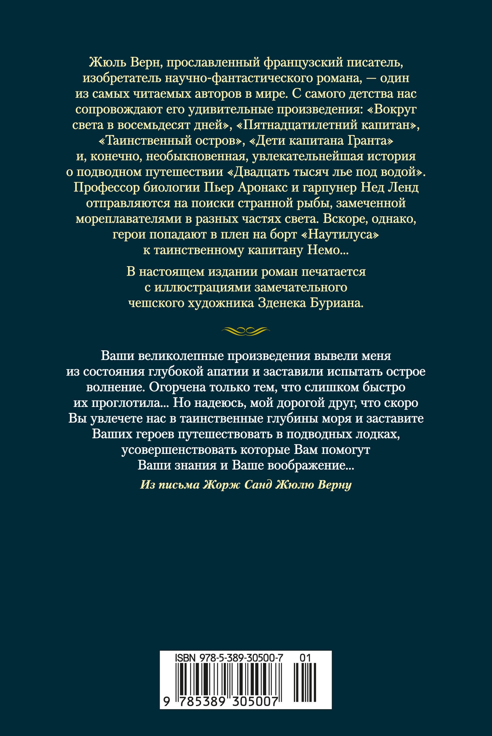 Жюль Верн, прославленный французский писатель, изобретатель научно-фантастического романа, - один из самых читаемых авторов в мире. С самого детства нас сопровождают его удивительные произведения: «Вокруг света в восемьдесят дней», «Пятнадцатилетний капитан», «Таинственный остров», «Дети капитана Гранта» и, конечно, необыкновенная, увлекательнейшая история о подводном путешествии «Двадцать тысяч лье под водой». Профессор биологии Пьер Аронакс и гарпунер Нед Ленд отправляются на поиски странной рыбы, замеченной мореплавателями в разных частях света. Вскоре, однако, герои попадают в плен на борт «Наутилуса» к таинственному капитану Немо... В настоящем издании роман печатается с иллюстрациями замечательного чешского художника Зденека Буриана. Прекрасный подарок всем любителям приключений! Качественное издание легендарного романа!| Издательство | Издательство АЗБУКА ООО |