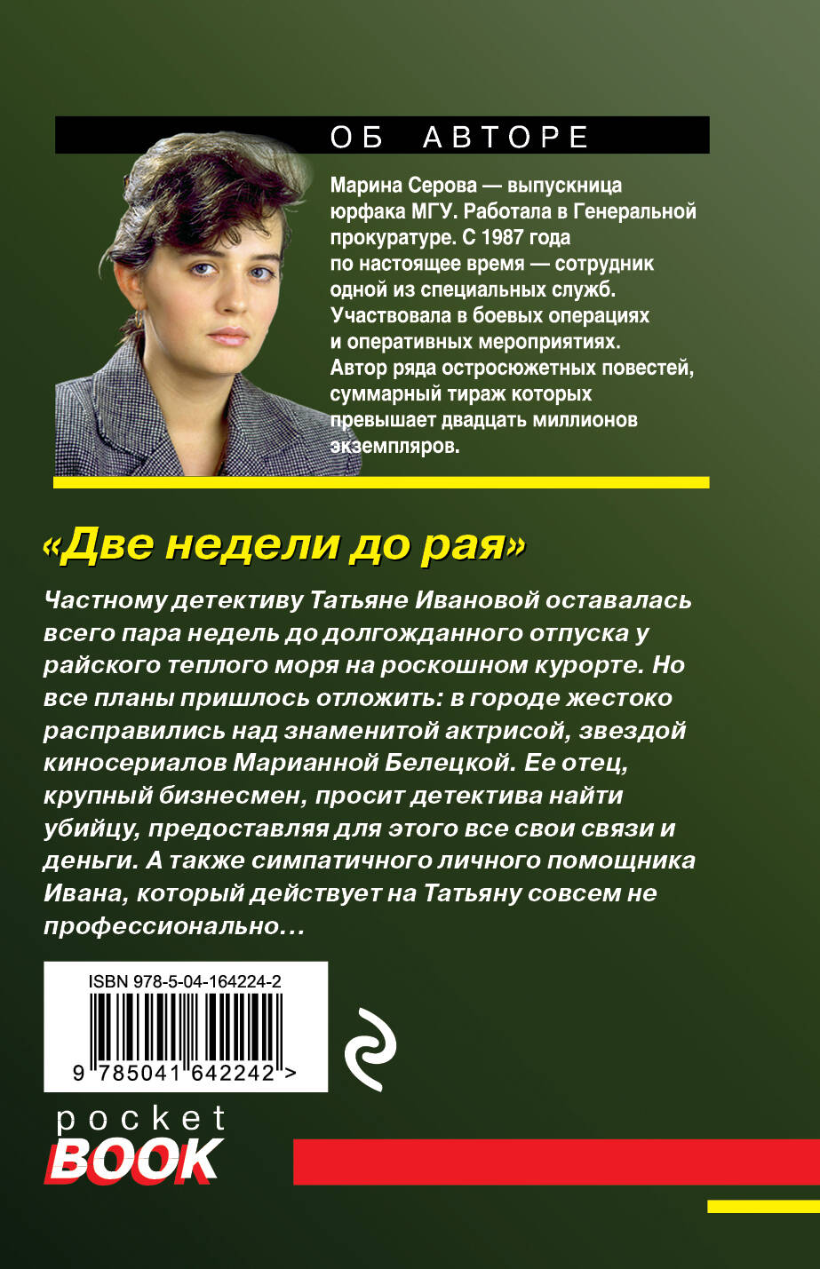 Частному детективу Татьяне Ивановой оставалась всего пара недель до долгожданного отпуска у райского теплого моря на роскошном курорте. Но все планы пришлось отложить: в городе жестоко расправились над знаменитой актрисой, звездой киносериалов Марианной Белецкой. Ее отец, крупный бизнесмен, просит детектива найти убийцу, предоставляя для этого все свои связи и деньги. А также симпатичного личного помощника Ивана, который действует на Татьяну совсем не профессионально… О том, как тяжело совмещать личное и профессиональное, как самые близкие люди могут предать и обмануть и кто на самом деле замешан в смерти актрисы, читайте в новом «Русском бестселлере» непревзойденной писательницы остросюжетной прозы. Марина Серова - феномен современного отечественного детективного жанра. Выпускница юрфака МГУ, работала в Генеральной прокуратуре. С 1987 года по настоящее время - сотрудник одной из специальных служб. Участвовала в боевых операциях и оперативных мероприятиях. Автор ряда остросюжетных повестей, суммарный тираж которых превышает двадцать миллионов экземпляров.| Издательство | Эксмо |