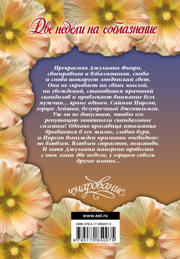 Прекрасная Джулиана Фиори, своенравная и взбалмошная, cнова и снова шокирует лондонский свет. Она не скрывает ни своих мыслей, ни убеждений, становится причиной скандалов и привлекает внимание всех мужчин… кроме одного. Саймон Пирсон, герцог Лейтон, безупречный джентльмен. Уж он не допустит, чтобы его репутацию запятнали скандальные сплетни! Однако красавица итальянка врывается в его жизнь, словно буря, и Пирсон вынужден признать очевидное: он влюблен. Влюблен страстно, неистово. И хотя Джулиана намерена провести с ним лишь две недели, у герцога совсем другие планы…