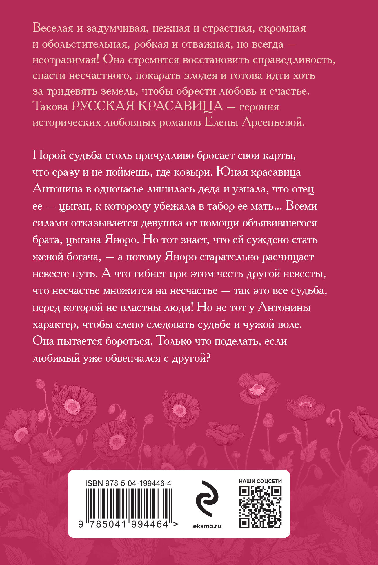 Библиография Елены Арсеньевой насчитывает более семи десятков детективных, исторических, любовных романов, а также несколько сборников новелл. В ее сказочно-фантастических повестях присутствуют не только реальные люди, но и волшебницы, колдуны, пришельцы из иных миров и множество других загадочных персонажей. Порой судьба столь причудливо бросает свои карты, что сразу и не поймешь, где козыри. Юная красавица Антонина в одночасье лишилась деда и узнала, что отец ее - цыган, к которому убежала в табор ее мать... Всеми силами отказывается девушка от помощи объявившегося брата, цыгана Яноро. Но тот знает, что ей суждено стать женой богача, - а потому Яноро старательно расчищает невесте путь. А что гибнет при этом честь другой невесты, что несчастье множится на несчастье - так это все судьба, перед которой не властны люди! Но не тот у Антонины характер, чтобы слепо следовать судьбе и чужой воле. Она пытается бороться. Только что поделать, если любимый уже обвенчался с другой?| Издательство | ООО "Издательство "Эксмо" |