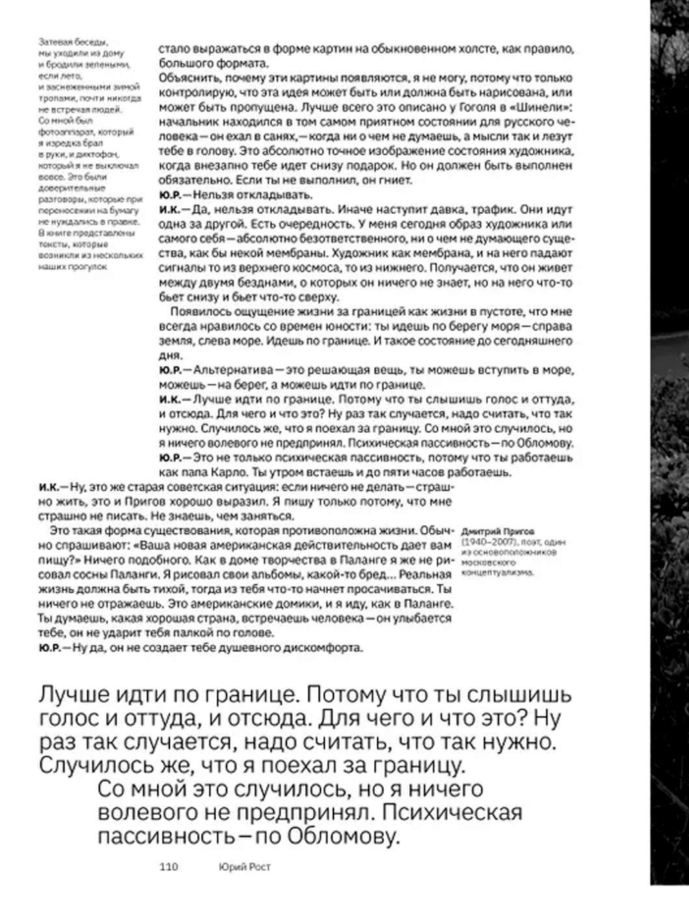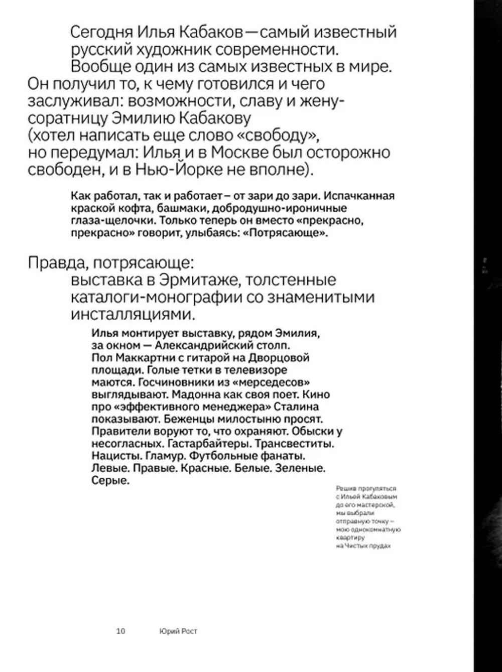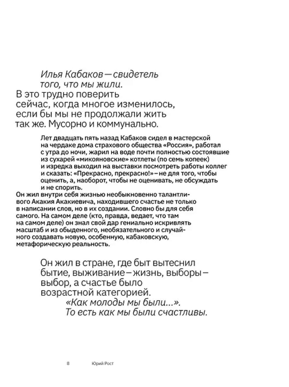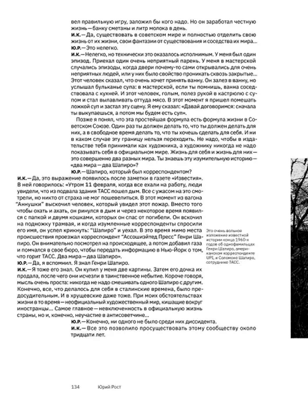 Перед вами уникальная книга - первая публикация расшифрованных текстов и фотографий из личного архива Юрия Роста. Летняя московская прогулка двух друзей Юрия Роста и Ильи Кабакова, тогда еще мало кому известных и совсем не знаменитых, превратилась в ностальгическое путешествие по пустынным субботним улицам с разговорами, окрашенными «странной печалью», о прошедших временах и нелегкой судьбе неформальных художников. Илья Кабаков - один из самых известных в мире современных русских художников, обладавший даром из «обыденного, необязательного и случайного создавать новую, особенную, кабаковскую метафорическую реальность». Юрий Рост - известный журналист, фотограф, автор десятка книг, актер, автор-исполнитель циклов популярных телепередач. Темы разговоров, которые читатель найдет в этоий книге, очень разные и часто неожиданные: московские - о странной жизни художников-нонконформистов и способах выживания неформального искусства за «железным занавесом», беседы в Нью-Йорке - о художнике, оказавшемся в реалиях чужой культуры, о судьбе его произведений, о победах и неудачах, о востребованности и славе. Книга адресована широкому кругу читателей, интересующихся современным искусством.| Издательство | Искусство - XXI век |