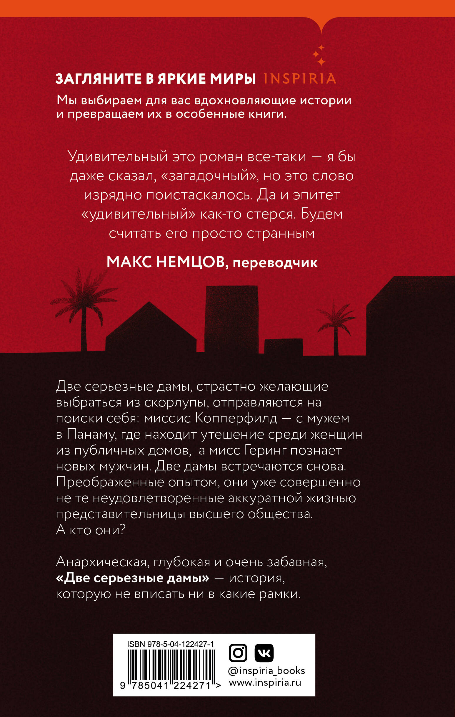 Джейн Боулз многие знают как жену Пола Боулза, признанного классика американской литературы двадцатого века. Однако Джейн - гений непризнанный. Хоть ее работы немногочисленны, Джейн Боулз по праву считается одной из лучших писательниц своего поколения. Ее проза остра, как бритва, забавна и чрезвычайно умна. В ней находит отображение то неуловимое состояние женщины, которая живет «аккуратно», прячась в скорлупе, и страстно желает выйти из зоны комфорта, даже если за ее пределами может быть опасно. Эксцентричная и авантюрная Кристина Гёринг встречает на вечеринке тревожную, но столь же решительную миссис Копперфилд. Две серьезные дамы, страстно желающие выбраться из скорлупы, отправляются на поиски себя: миссис Копперфилд - с мужем в Панаму, где находит утешение среди женщин из публичных домов, а мисс Геринг познает новых мужчин. Две дамы встречаются снова. Преображенные опытом, они уже совершенно не те неудовлетворенные аккуратной жизнью представительницы высшего общества. А кто они? Анархическая, глубокая и очень забавная, «Две серьезные дамы» - история, которую не вписать ни в какие рамки.| Издательство | ООО "Издательство "Эксмо" |