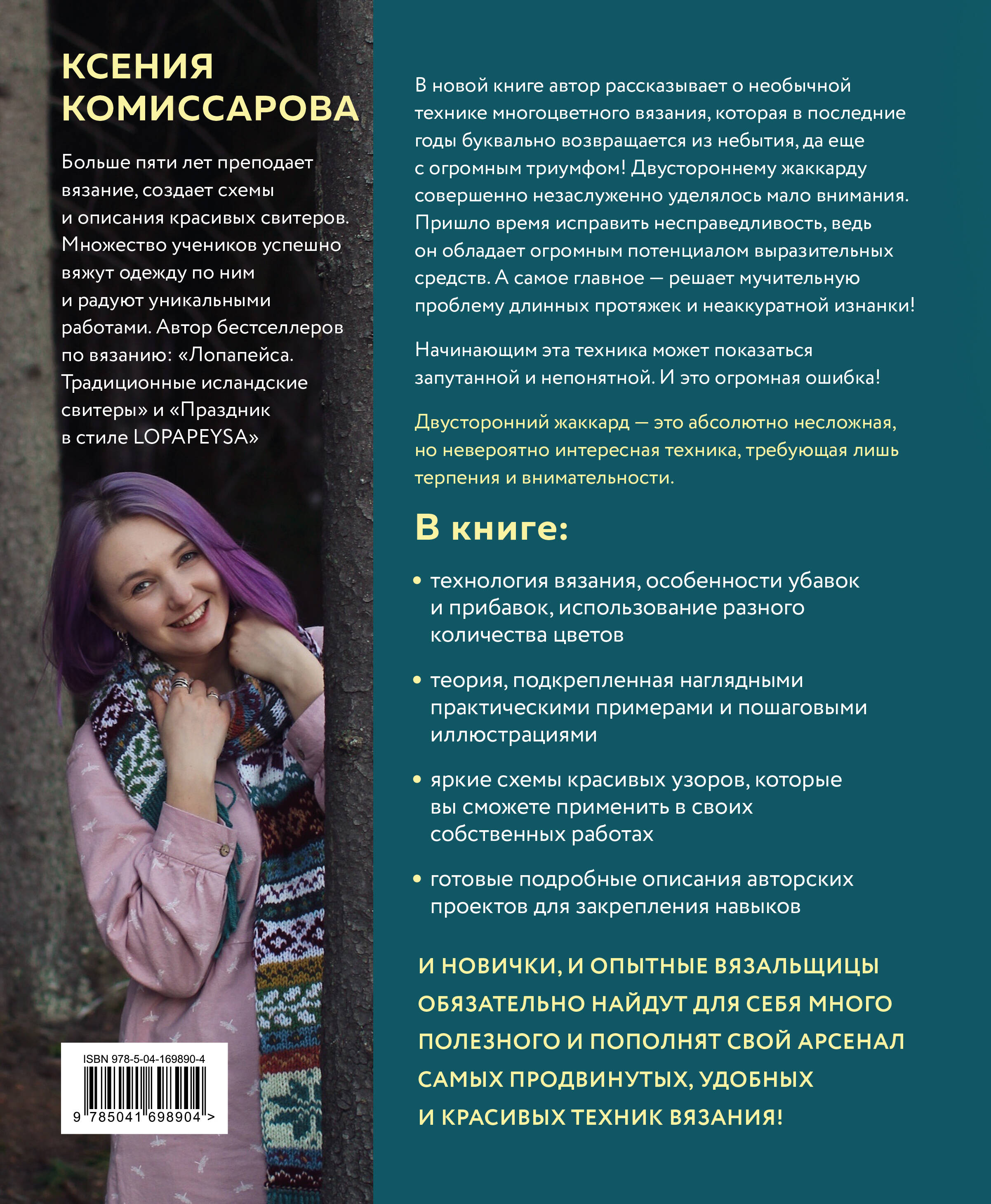 Новая книга популярного блогера и автора бестселлеров о вязании в стиле Лопапейса Ксении Комиссаровой - необычна! В ней во всей красе раскрывается перед нами такая необычная и эффектная техника, как двустороннее многоцветное вязание. В чем же ее преимущества? Первое и самое главное - вы вяжете одну вещь, а в итоге получаете целых две! Ведь полотно, связанное в этой технике, лицевое с обеих сторон. Только зеркально отражаются цвета узоров. Высший пилотаж, когда получаешь возможность надеть изделие как с лицевой, так и с изнаночной стороны, по настроению. Второе, но не менее важное - идеальная изнанка! Никаких узлов и протяжек. Крайне важно для всех, кто вяжет шарфы, шали, накидки, пончо. Да и полы кардигана порой могут распахнуться. И можно быть уверенными, что с изнанки это будет выглядеть блестяще! На первый взгляд техника двустороннего вязания кажется сложной. Но Ксения Комиссарова взялась развенчать этот миф: шаг за шагом она посвящает читателя в нюансы и секреты, показывая каждый шаг работы на ярких фотографиях. И в результате становится понятно, что достаточно научиться читать схемы и быть предельно сосредоточенным, чтобы не запутаться во время работы. И никаких лишних сложностей. Идеальный вариант для снудов, шарфов, шапок, свитеров, пледов и многого другого. Разнообразные узоры, готовые авторские модели с описаниями, пошаговые мастер-классы. Гениальная книга для того, чтобы освоить новое!