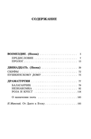 Поэма "Возмездие", вошедшая в настоящий сборник, подтверждает этот эпитет, и еще раз доказывает, что "трещина, расколовшая мир, проходит через сердце поэта". В сборник включены поэма "Двенадцать", вызвавшая столь неоднозначную оценку современников, "программные" стихотворения "Скифы" и "Пушинскому дому", знаменитая речь "О назначени поэта", а также драматургические произведения Блока.