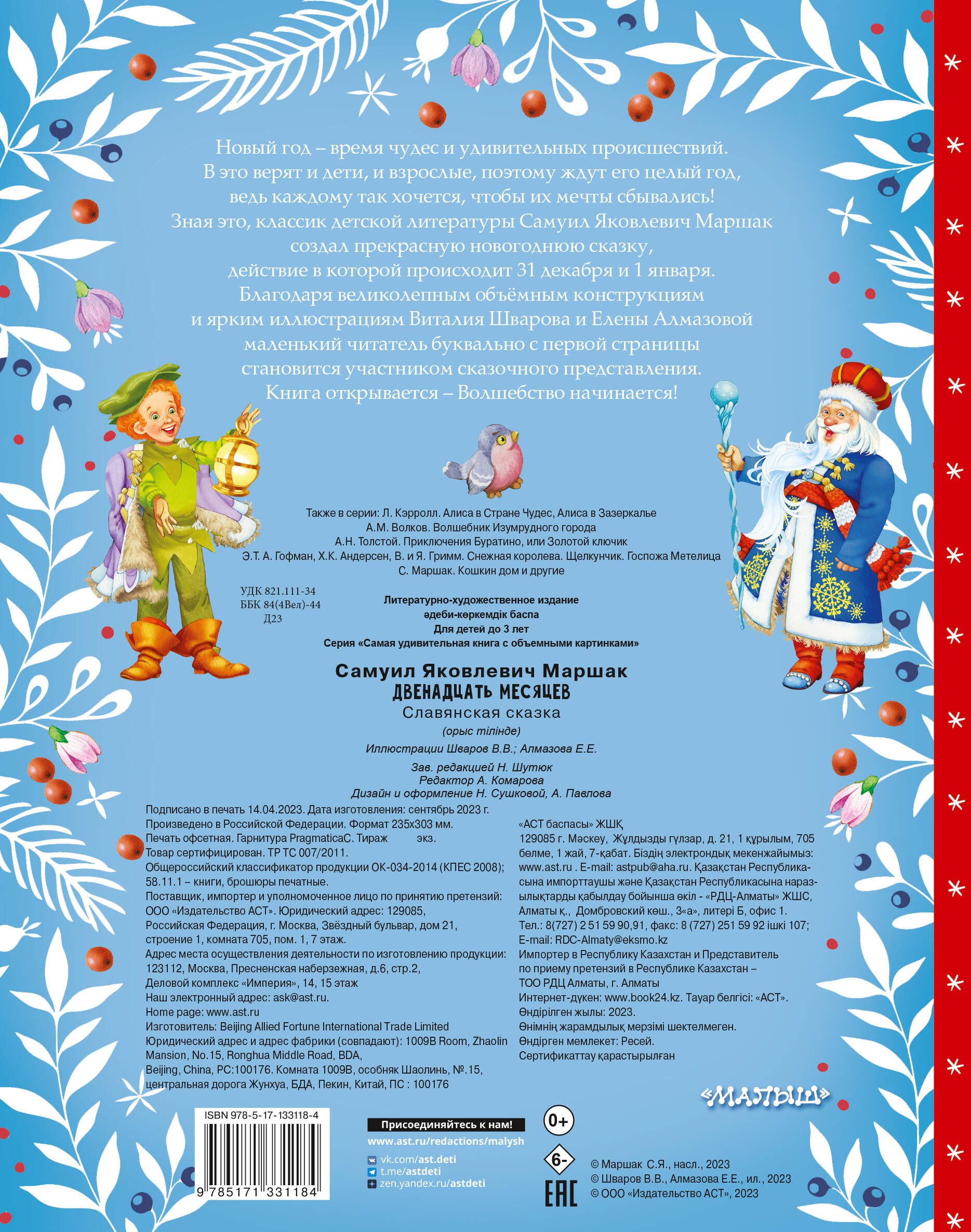 Новый год - время чудес и удивительных происшествий. В это верят и дети, и взрослые, поэтому ждут его целый год, ведь каждому так хочется, чтобы их мечты сбывались! Зная это, классик детской литературы Самуил Яковлевич Маршак создал прекрасную новогоднюю сказку, действие в которой происходит 31 декабря и 1 января. Благодаря великолепным объёмным конструкциями и ярким иллюстрациям Виталия Шварова и Елены Алмазовой маленький читатель буквально с первой страницы становится участником сказочного представления. Книга открывается - волшебство начинается!| Издательство | ИЗДАТЕЛЬСТВО "АСТ" |