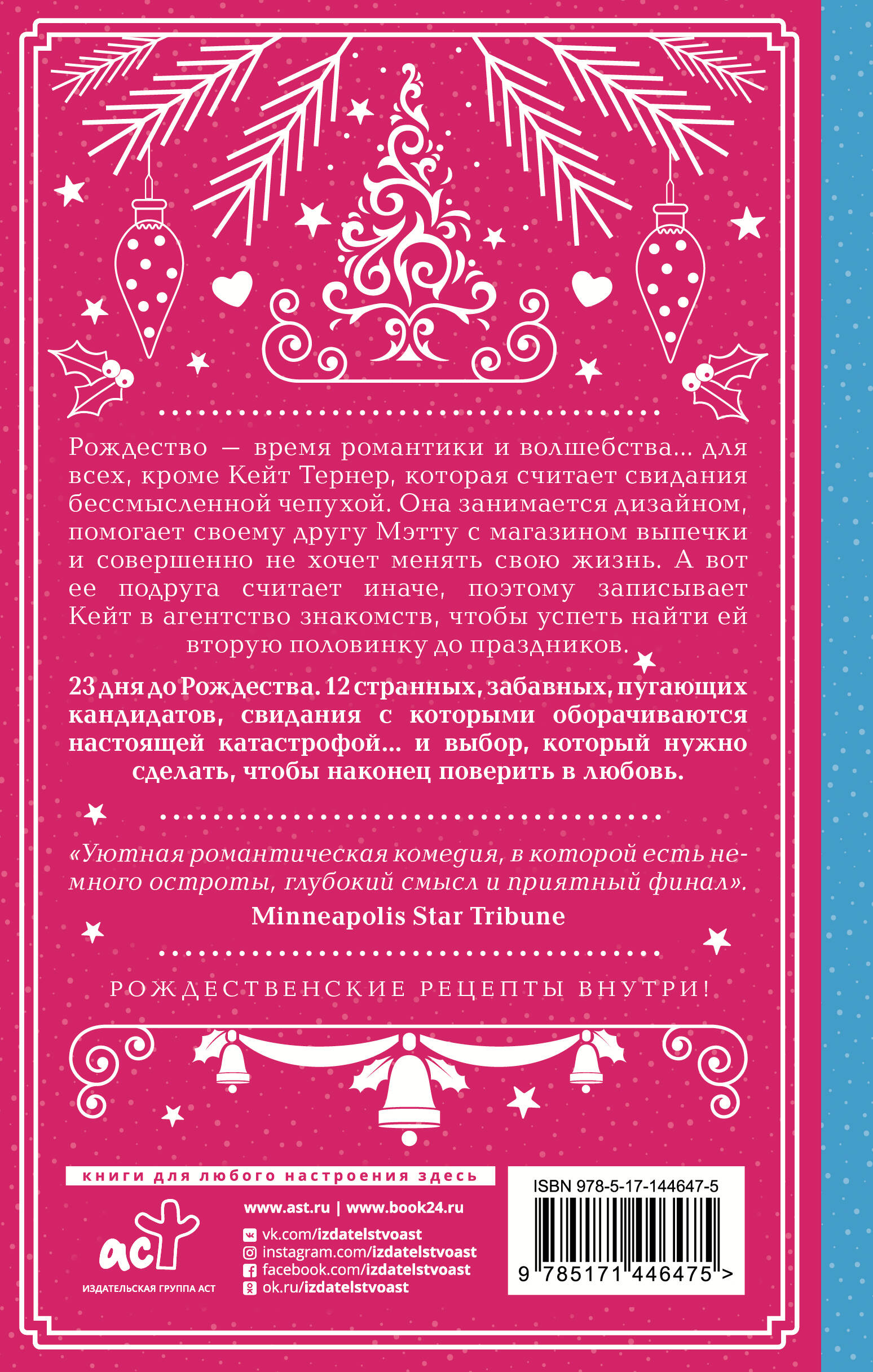 Романтическая история, насквозь пропитанная какао с корицей и маршмэллоу. Рождество - лучшее время, чтобы встретить свою любовь. Кейт ничего такого не планирует и вообще избегает свиданий. За последний год у нее наберется от силы два. А здесь появляется возможность за 3 недели посетить 12 свиданий. Кейт не может назвать это удачей, скорее пыткой. Ее лучшая подруга Лаура записывает Кейт на этот марафон слепых свиданий и не принимает отказа. 12 кандидатов, хотя бы один сможет понравиться Кейт и встретить с ней Рождество? Увидим. По крайней мере Кейт клянется не саботировать свидания, ведь ее ухажеры и сами отлично с этим справляются.| Издательство | Издательство "АСТ" |