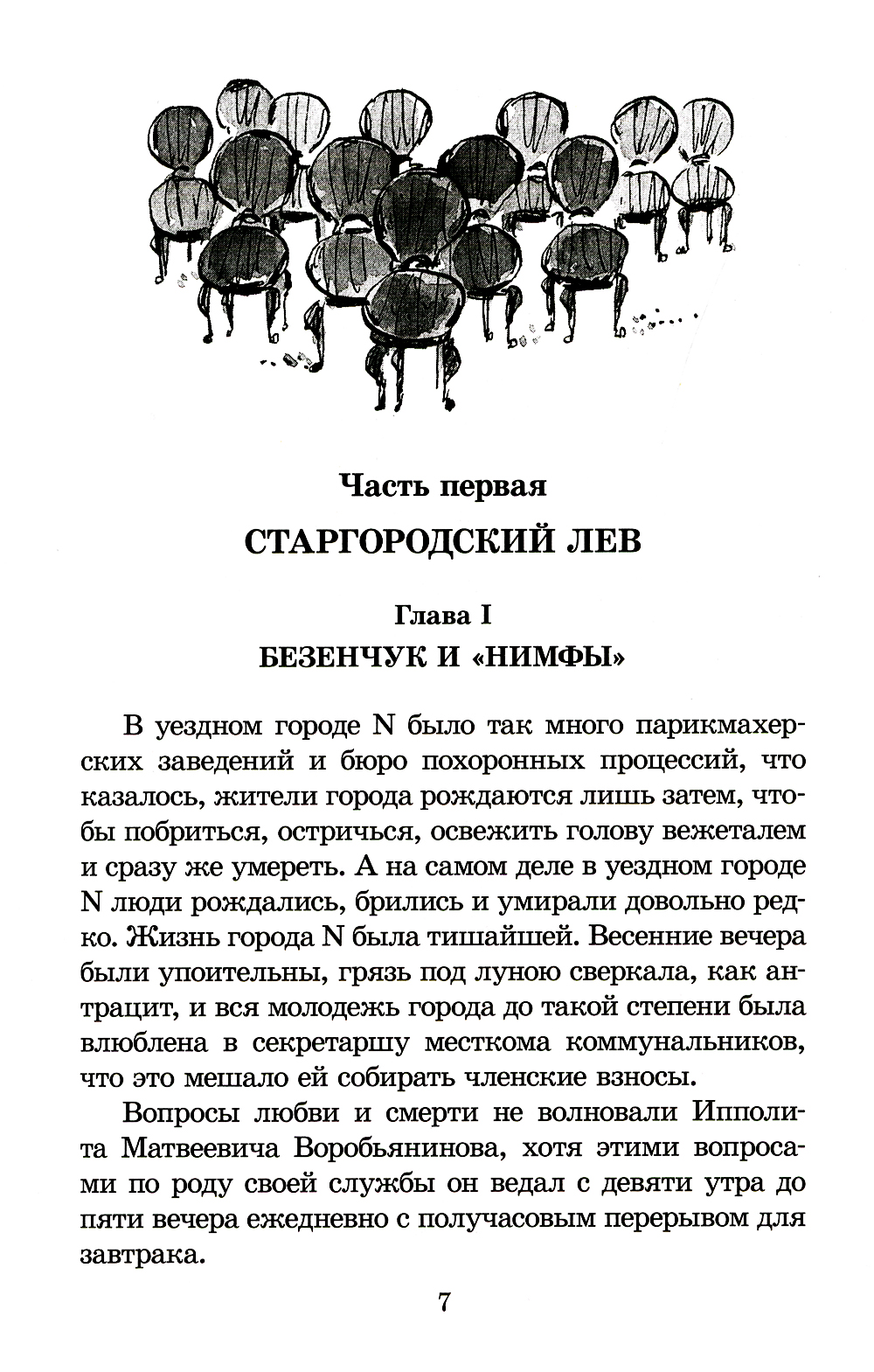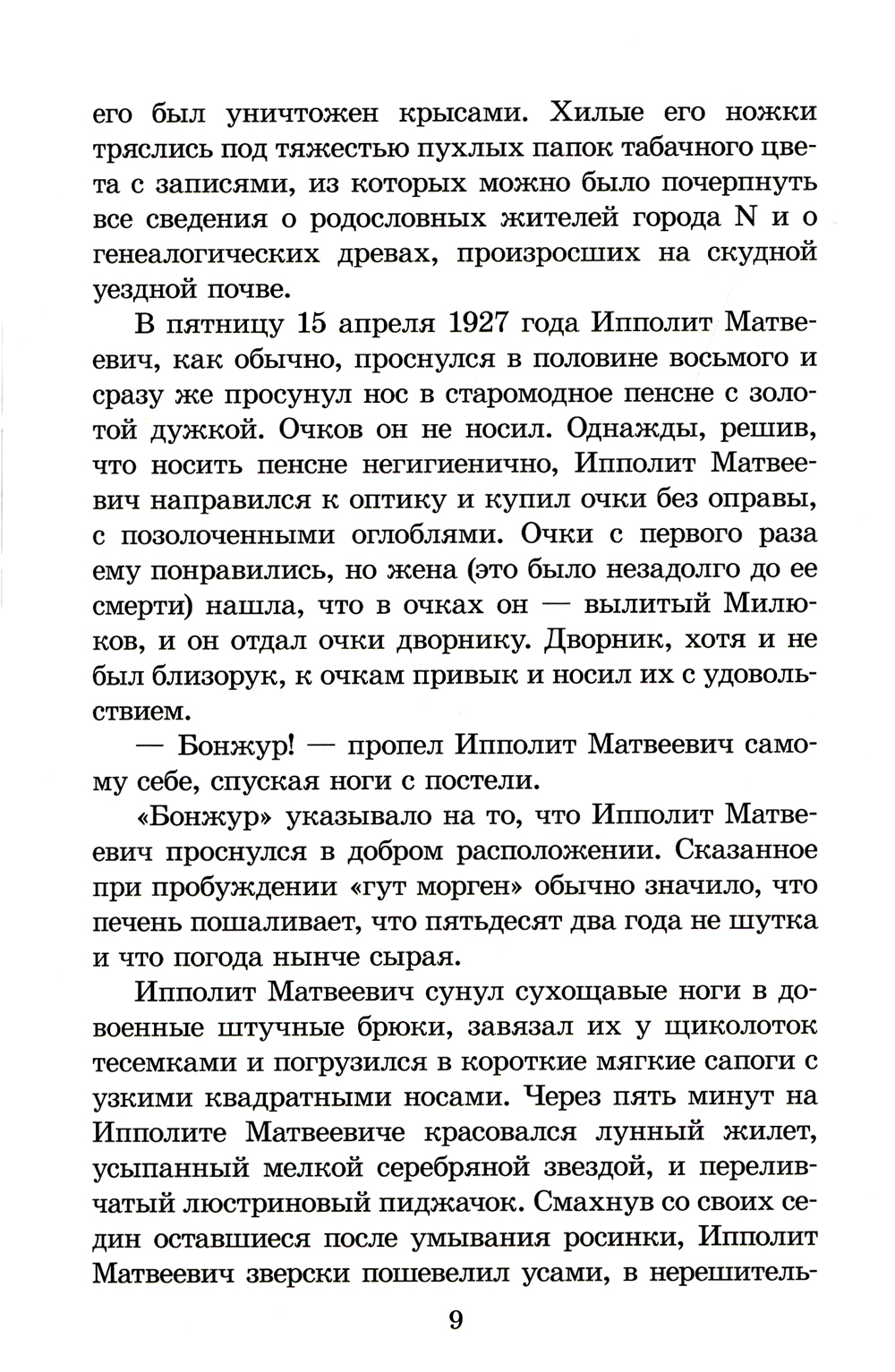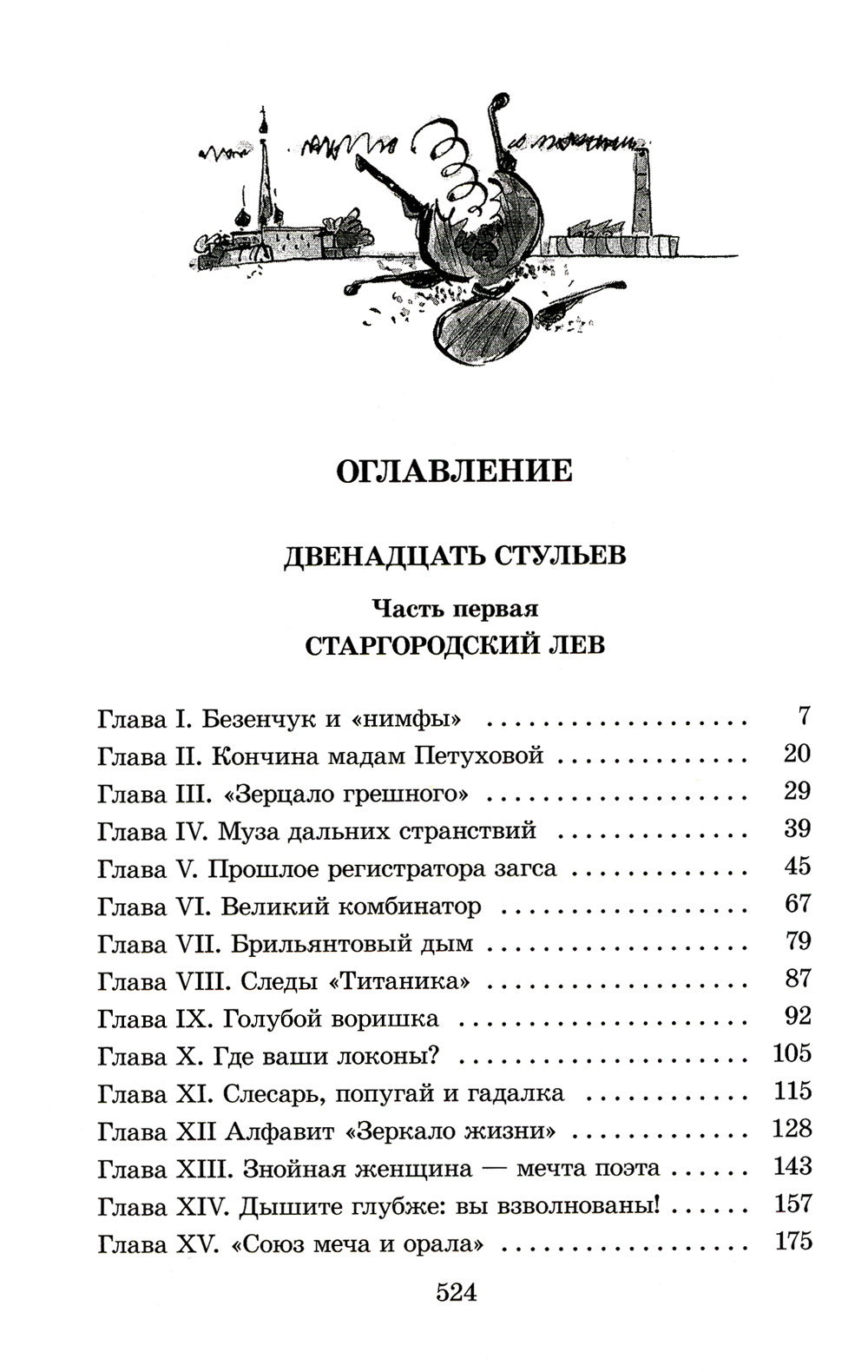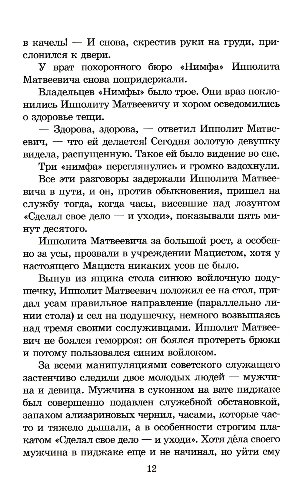 История про то, как "великий комбинатор" Остап Бендер вместе со своим "напарником" Кисой Воробьяниновым пытаются найти бриллианты мадам Петуховой, спрятанные в одном из 12 стульев мебельного гарнитура, стала поистине "народной классикой". Герои ведут за собой по гремящим двадцатым годам двадцатого века, по провинциальным улочкам, через столичные площади. Читать, перечитывать, вдохновляться, смеяться, сопереживать, проживать и делать выводы. Всё это надо именно с книгой Ильфа и Петрова. И как сказал бы герой этой книги Остап Бендер: "Согласны? Ну, по глазам вижу, что согласны!"