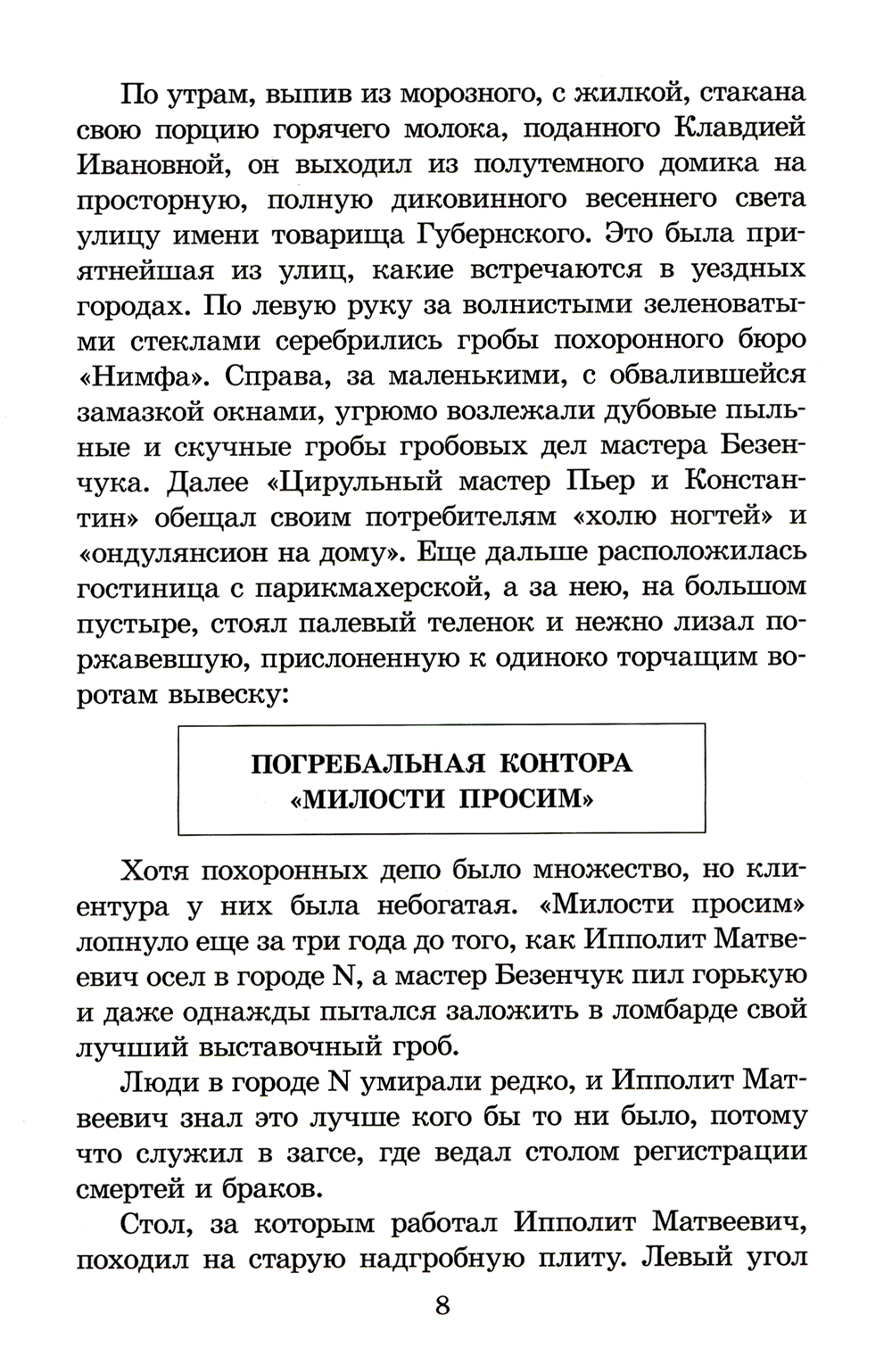 Знаменитый сатирический роман конца 20-х годов прошлого века. В центре его - образ Остапа Бендера, обаятельного жулика, авантюриста, натуры артистической и независимой, с великолепным чувством юмора.