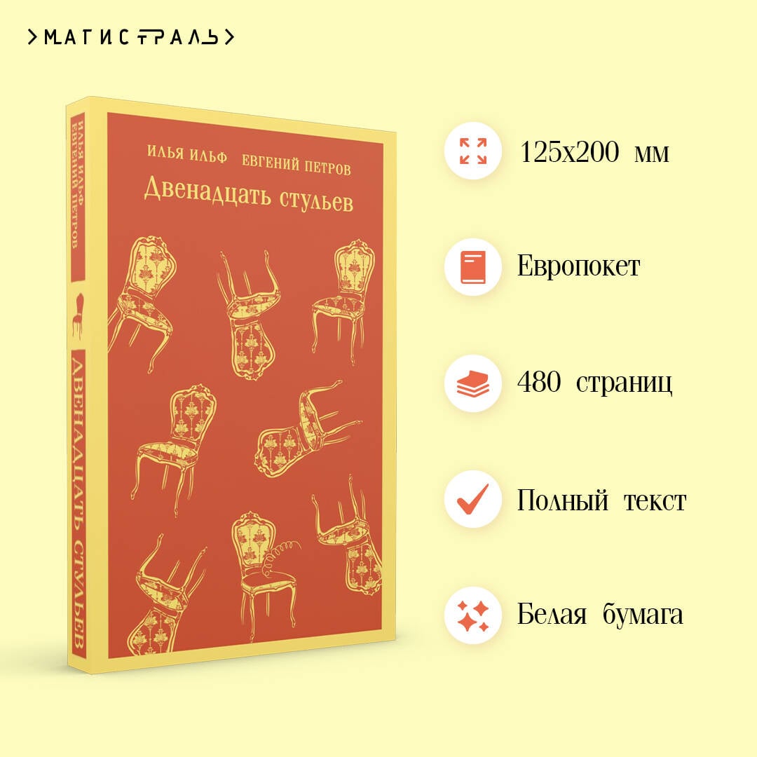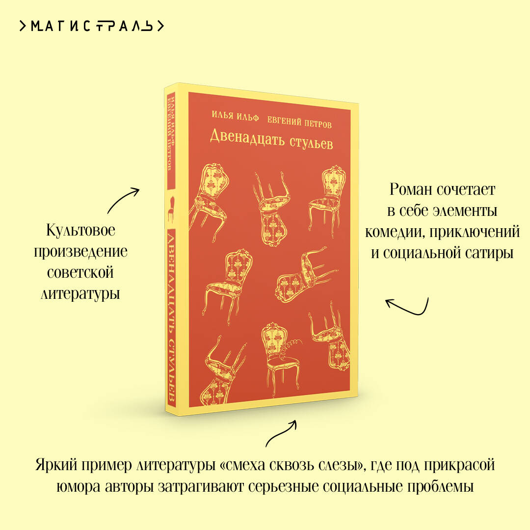 Роман Ильи Ильфа и Евгения Петрова «Двенадцать стульев» по праву считается эталоном сатиры и юмора. Единодушно любимый всеми читателями, этот роман вошел в «золотой фонд» русской и мировой литературы. Поиски брильянтов мадам Петуховой, спрятанных в одном из стульев мебельного гарнитура, - история, которая и по сей день вызывает искреннюю улыбку. Имена героев - обаятельных авантюристов - стали нарицательными, а сам роман разошелся на цитаты, выдержав сотни успешных переизданий и заслуженно снискав славу неувядающего бестселлера.| Издательство | ООО "Издательство "Эксмо" |