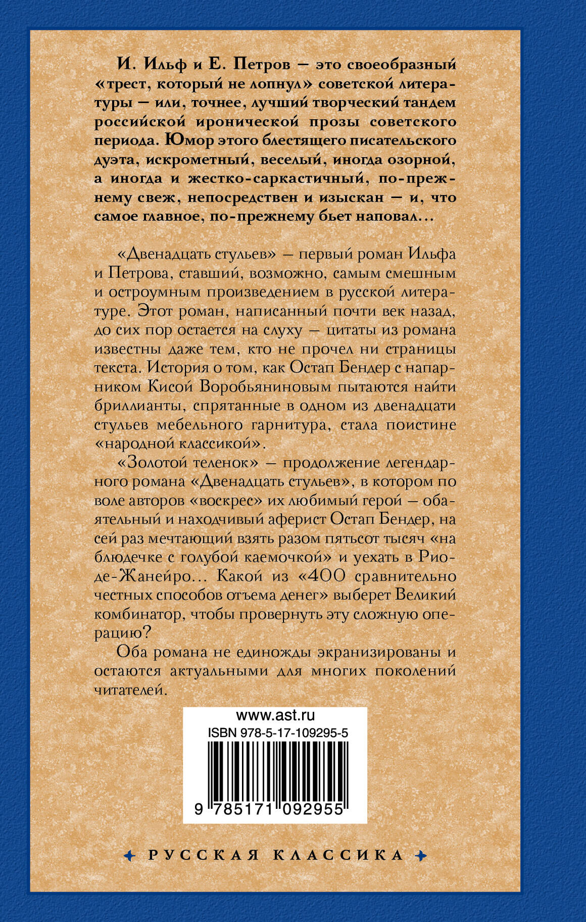"Двенадцать стульев" - первый роман Ильфа и Петрова, ставший, возможно, самым смешным и остроумным произведением в русской литературе. Этот роман, написанный почти век назад, до сих пор остается на слуху - цитаты из романа известны даже тем, кто не прочел ни страницы текста. История о том, как Остап Бендер с напарником Кисой Воробьяниновым пытаются найти бриллианты, спрятанные в одном из двенадцати стульев мебельного гарнитура, стала поистине "народной классикой". "Золотой теленок" - продолжение легендарного романа "Двенадцать стульев", в котором по воле авторов "воскрес" их любимый герой - обаятельный и находчивый аферист Остап Бендер, на сей раз мечтающий взять разом пятьсот тысяч "на блюдечке с голубой каемочкой" и уехать в Рио-де-Жанейро… Какой из "400 сравнительно честных способов отъема денег" выберет Великий комбинатор, чтобы провернуть эту сложную операцию? Оба романа не единожды экранизированы и остаются актуальными для многих поколений читателей.| Издательство | ИЗДАТЕЛЬСТВО "АСТ" |