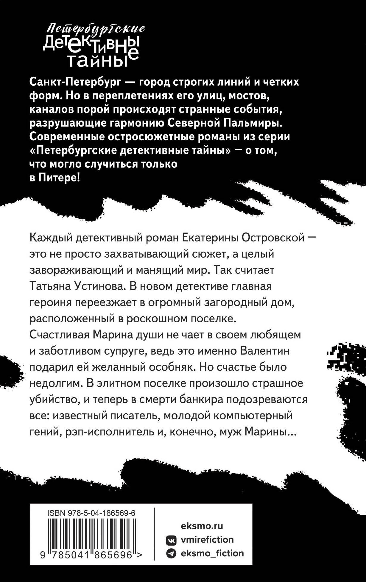 Каждый детективный роман Екатерины Островской - это не просто захватывающий сюжет, а целый завораживающий и манящий мир. Так считает Татьяна Устинова. В новом детективе главная героиня переезжает в огромный загородный дом, расположенный в роскошном поселке. Счастливая Марина души не чает в своем любящем и заботливом супруге, ведь это именно Валентин подарил ей желанный особняк. Но счастье было недолгим. В элитном поселке произошло страшное убийство, и теперь в смерти банкира подозреваются все: известный писатель, молодой компьютерный гений, рэп-исполнитель и, конечно, муж Марины... Татьяна Устинова рекомендует: «Островская играет жизнями, тасует героев, заставляет их совершать неожиданные и странные поступки, а читателя - с замиранием сердца следить за ними и гадать: сработает, не сработает, выберутся, не выберутся!.. Сюжет то и дело поворачивает в какую-то другую сторону и на полной скорости несется дальше. Это почти невозможно, но ей удается удержаться на этих виражах!.. И очень хочется, чтобы у героев все получилось!.. И финал! Он всегда феерический, во всех отношениях».| Издательство | ООО "Издательство "Эксмо" |