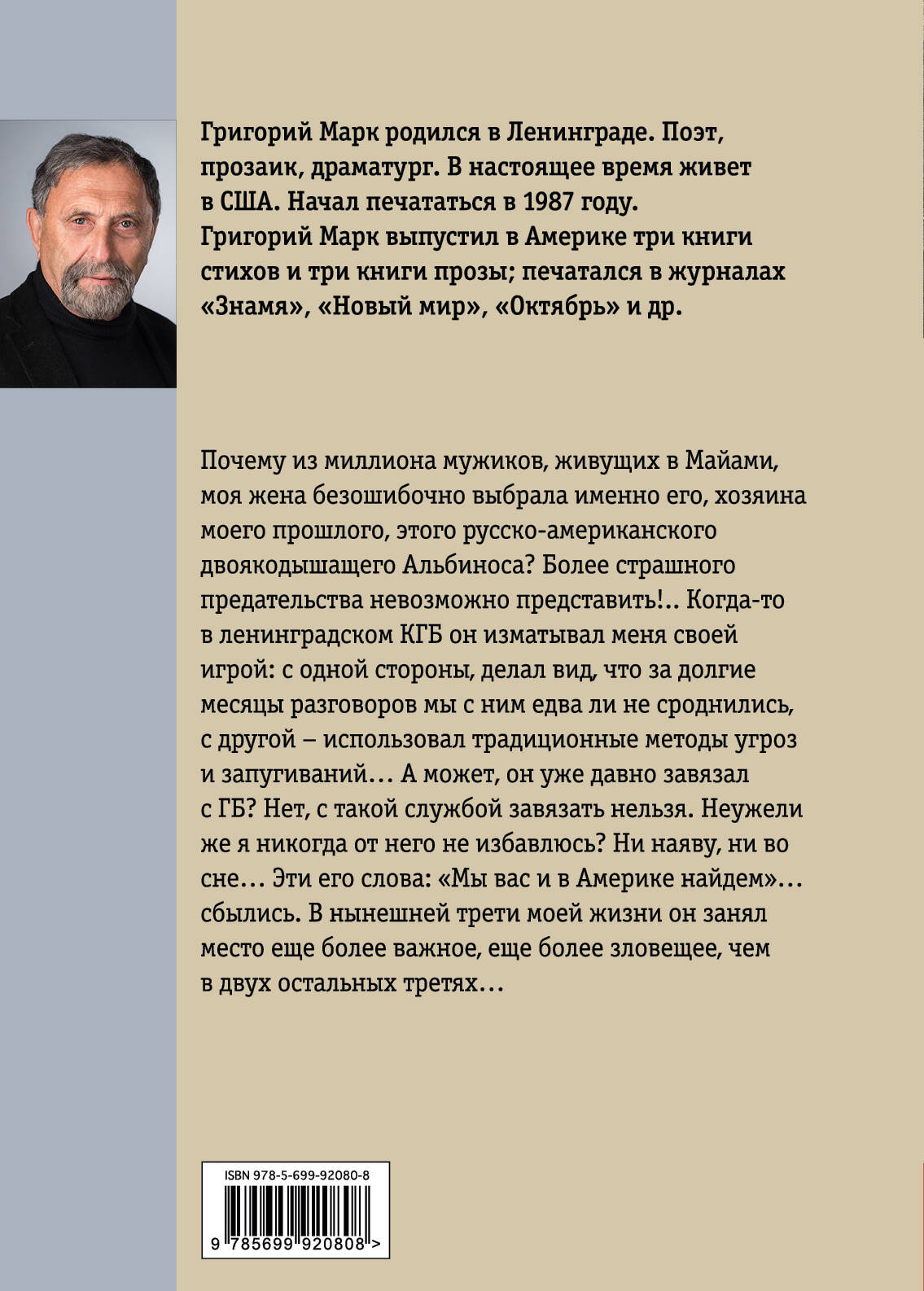 Почему из миллиона мужиков, живущих в Майами, моя жена безошибочно выбрала именно его, хозяина моего прошлого, этого русско-американского двоякодышащего Альбиноса? Более страшного предательства невозможно представить!.. Когда-то в ленинградском КГБ он изматывал меня своей игрой: с одной стороны, делал вид, что за долгие месяцы разговоров мы с ним едва ли не сроднились, с другой - использовал традиционные методы угроз и запугиваний… А может, он уже давно завязал с ГБ? Нет, с такой службой завязать нельзя. Неужели же я никогда от него не избавлюсь? Ни наяву, ни во сне… Эти его слова: "Мы вас и в Америке найдем"… сбылись. В нынешней трети моей жизни он занял место ещё более важное, ещё более зловещее, чем в двух остальных третях…