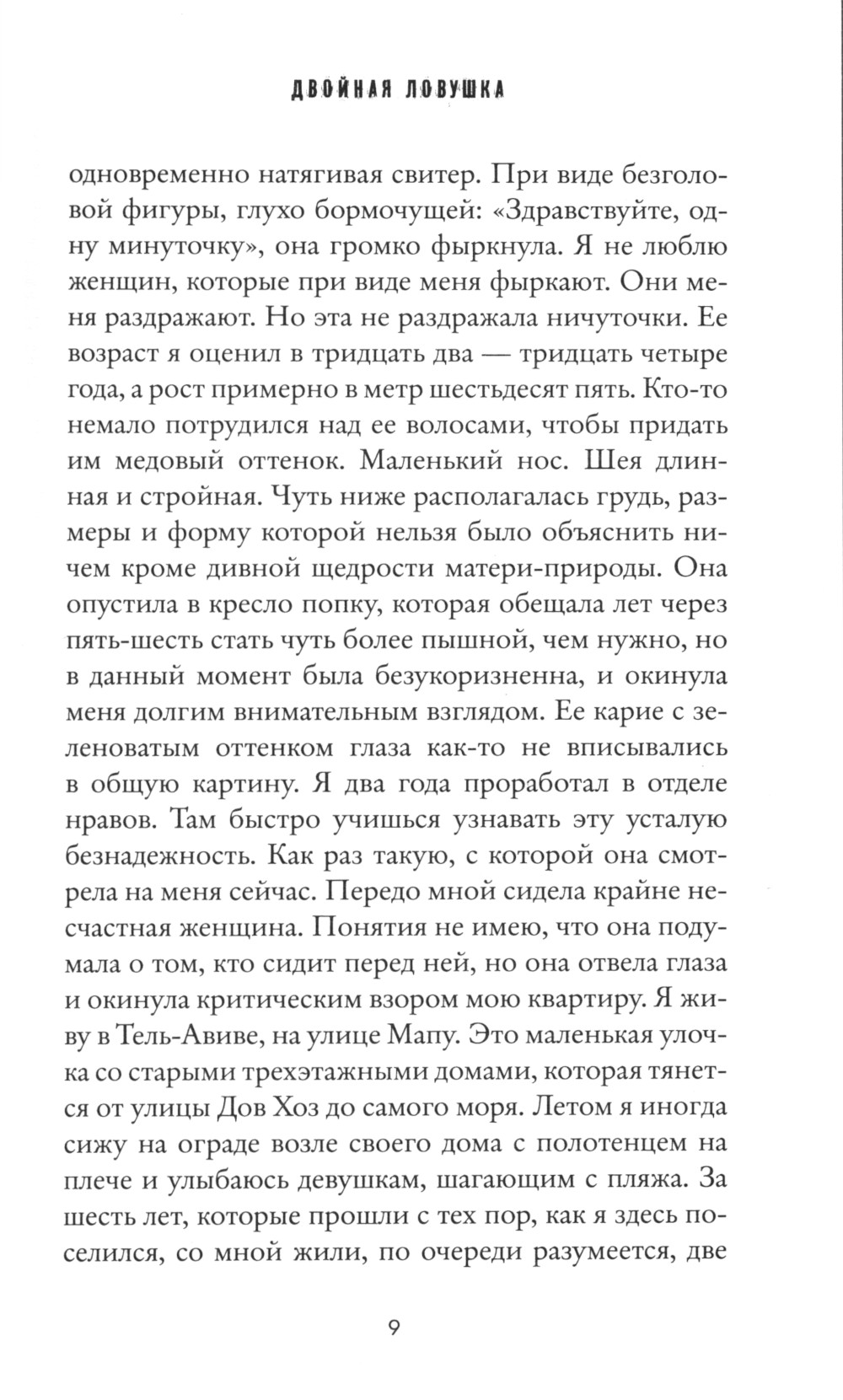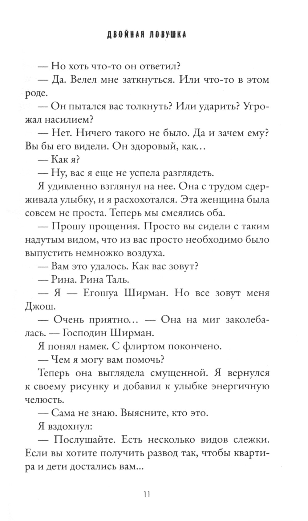 Джош Ширман - бывший полицейский, ныне частный детектив. Саркастичный одиночка, скрывающий за манерами крутого парня чувствительную натуру, он добивается результата там, где бессильна полиция. В «Двойной ловушке» Джош Ширман берется следить за неверным мужем по заказу его жены, а в результате выходит на крупнейшую аферу с бриллиантами, расследование которой едва не стоит ему жизни.| Издательство | Синдбад |