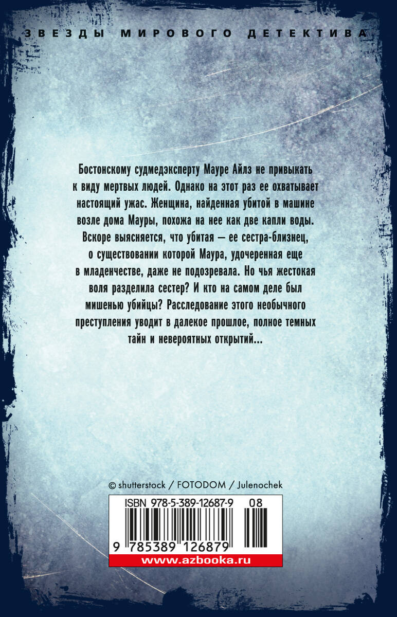 Бостонскому судмедэксперту Мауре Айлз не привыкать к виду мертвых людей. Однако на этот раз ее охватывает настоящий ужас. Женщина, найденная убитой в машине возле дома Мауры, похожа на нее как две капли воды. Вскоре выясняется, что убитая - ее сестра-близнец, о существовании которой Маура, усыновленная еще в младенчестве, даже не подозревала. Но чья жестокая воля разделила сестер? И кто на самом деле был мишенью убийцы? Расследование этого необычного преступления уводит в далекое прошлое, полное темных тайн и невероятных открытий.| Издательство | Азбука-Аттикус Издат.группа ООО |