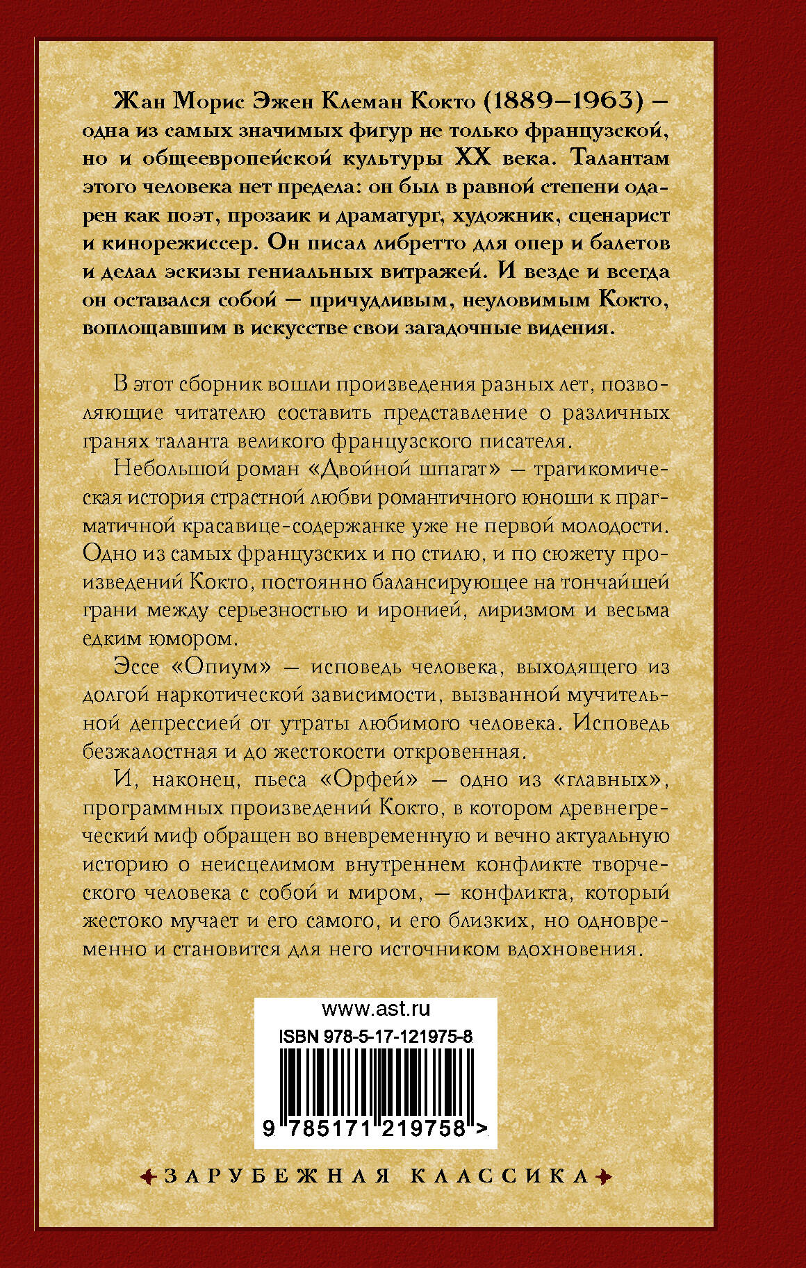 В этот сборник вошли произведения разных лет, позволяющие читателю составить представление о различных гранях таланта великого французского писателя. Небольшой роман "Двойной шпагат" - трагикомическая история страстной любви романтического юноши к прагматичной красавице-содержанке уже не первой молодости. Одно из самых французских и по стилю, и по сюжету произведений Кокто, постоянно балансирующее на тончайшей грани между серьезностью и иронией, лиризмом и весьма едким юмором. Эссе "Опиум" - исповедь человека, выходящего из долгой наркотической зависимости, вызванной мучительной депрессией от утраты любимого человека. Исповедь безжалостная и до жестокости откровенная. И, наконец, пьеса "Орфей" - одно из "главных", программных произведений Кокто, в котором древнегреческий миф обращен во вневременную и вечно актуальную историю о неисцелимом внутреннем конфликте творческого человека с собой и миром, - конфликта, который жестоко мучает и его самого, и его близких, но одновременно и становится для него источником вдохновения.| Издательство | АСТ |