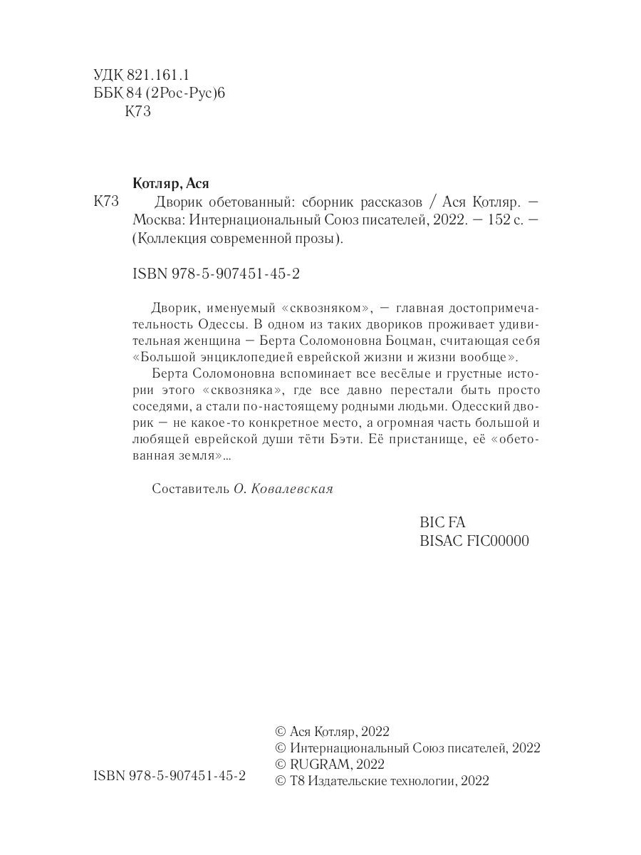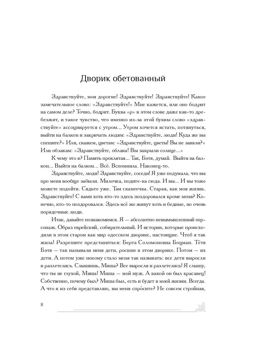 Берта Соломоновна вспоминает все весёлые и грустные истории этого «сквозняка», где все давно перестали быть просто соседями, а стали по-настоящему родными людьми. Одесский дворик - не какое-то конкретное место, а огромная часть большой и любящей еврейской души тёти Бэти. Её пристанище, её «обетованная земля»...