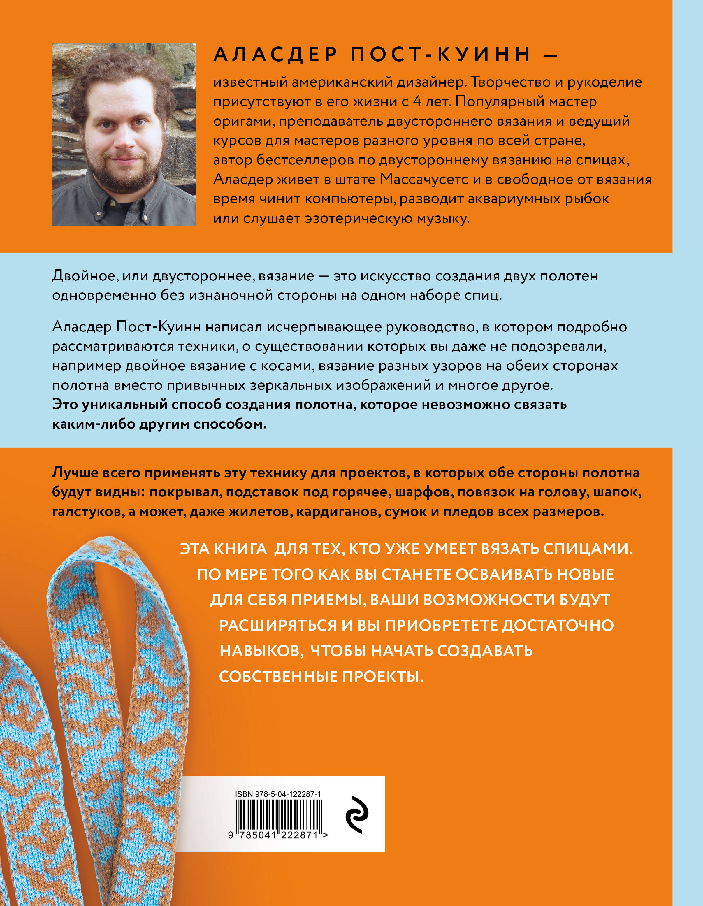 Вязание - настоящее приключение для тех, кто любит новое, необычное и предпочитает открытия повседневной рутине. Так считает автор этой книги, которая действительно полна открытий, американский дизайнер Аласдер Пост-Куинн. Мало того, что это самое углубленное и исчерпывающее пособие по двустороннему вязанию в мире. Оно содержит такие техники и секреты, к которым не подступался ни один автор до сих пор. Как вам двустороннее полотно с косами? А два разных рисунка, которые вяжутся одновременно на двух сторонах одного полотна? Конечно, эти приемы и техники не для новичков в вязании, но те, кто уже имеет опыт и навыки, несомненно будут поражены тем арсеналом возможностей, которым делится автор. Двустороннее вязание само по себе инновационно и решает массу проблем, например, избавляет от протяжек на изнаночной стороне работы. А двустороннее вязание с Аласдером, личностью неординарной и творческой, становится настоящим приключением, ведь мастерство его последователей взлетает до небес! «Хочется верить, что мой труд заставит других людей задуматься: какие возможности открываются перед ними, если вязание не ограничено одним слоем полотна». - Аласдер Пост-Куинн| Издательство | ООО "Издательство "Эксмо" |