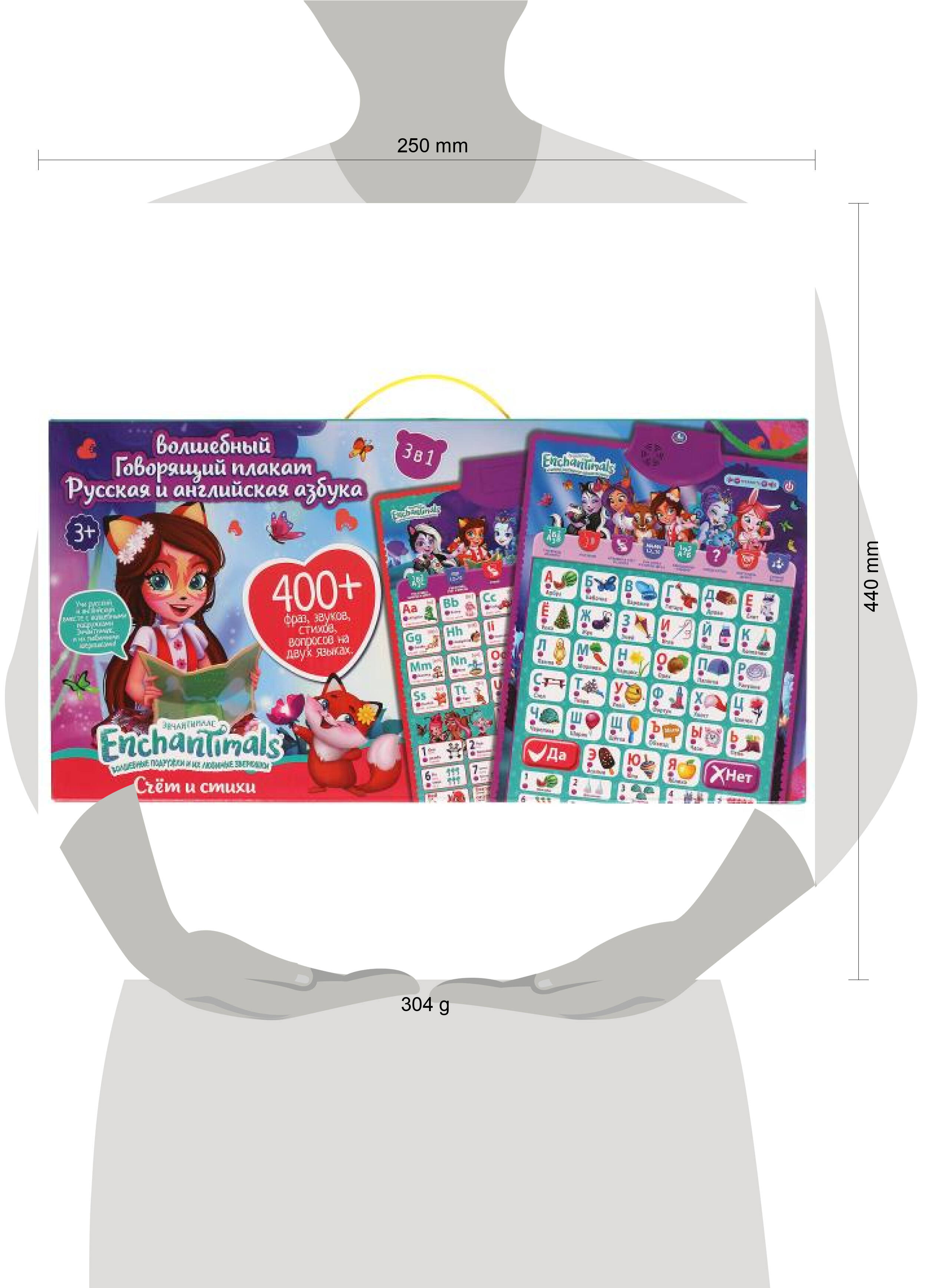 Двусторонний говорящий плакат 3 в 1 "Enchantimals. Русская и английская азбука" ТМ "УМка" станет прекрасным подарком для поклонников волшебных подружек из Зачарованного леса и из питомцев: - 400 фраз, звуков, стихов, вопросов на 2-х языках - красочный дизайн с любимыми персонажами - регулировка громкости - кнопка "Вкл./Выкл." Полезная "база" для обучения ребёнка в виде говорящего плаката. Преподнесённую в визуальном и звуковом форматах информацию малышу будет проще усвоить и запомнить. В лёгкой игровой форме ребёнок выучит русский и английский алфавит, цифры на двух язык, с удовольствием будет слушать стихи и песни. Игровые занятия с говорящим плакатом ТМ "УМка" расширяют кругозор и способствуют развитию: - памяти - внимания - визуального и слухового восприятия - речи Размер: 42 х 59 х 2 см. Материал: пластмасса + металл. Работает от 3-х батареек типа ААА (не входят в комплект). Рекомендовано детям от 3-х лет.| Издательство | СИМБАТ ООО |