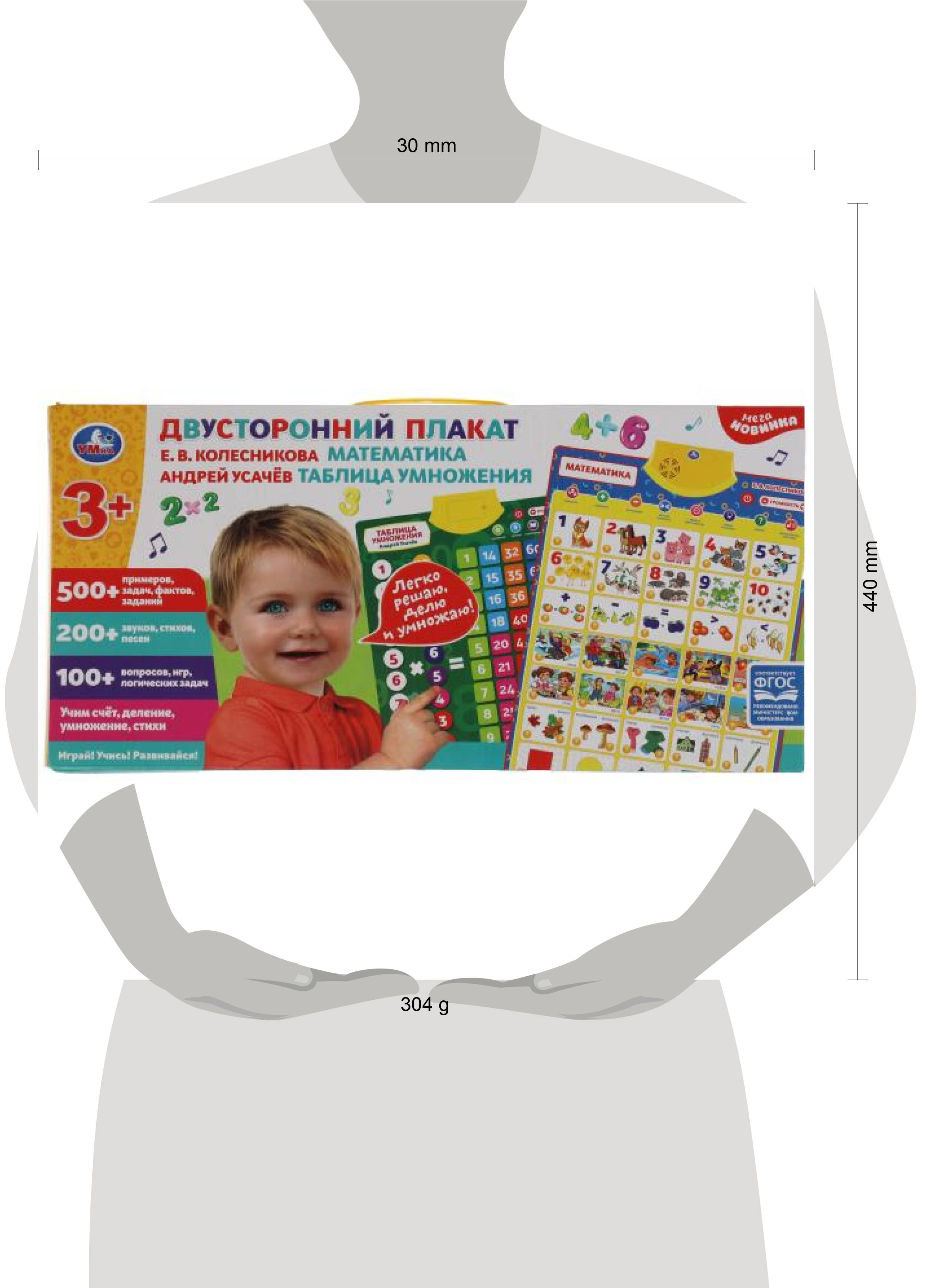 Обучающий двусторонний плакат "Е.В. Колесникова. Математика" и "А. Усачёв. Таблица умножения" ТМ "Умка" - многофункциональный помощник малышу в познании окружающего мира: - 4 песни из м/ф: "Всё мы делим пополам", "Вместе весело шагать", "Чему учат в школе", "Дважды два - четыре" - 500+ примеров, задач, фактов, заданий - 200+ звуков, стихов, песен - 100+ вопросов, игр, логических задач - учим счёт, деление, умножение и стихи - кнопка "Вкл./Выкл." - регулировка громкости - соответствует ФГОС С помощью плаката ребёнок познакомится с основами счета, а так же с таблицей умножения. Малыш легко научится управляться с плакатом самостоятельно. Благодаря песням, стихотворениям и интересным заданиям, обучение превратится в интересную игру. Обучающий плакат ТМ "Умка" поможет развить ребёнку: - слуховое восприятие - визуальное восприятие - память - тактильные навыки - моторику - координацию движений - логику Размер: 2 x 59 x 42 см. Материал: пластмасса + металл. Работает от 3-х батареек типа ААА (не входят в комплект). Рекомендовано детям от 3-х лет.| Издательство | СИМБАТ ООО |