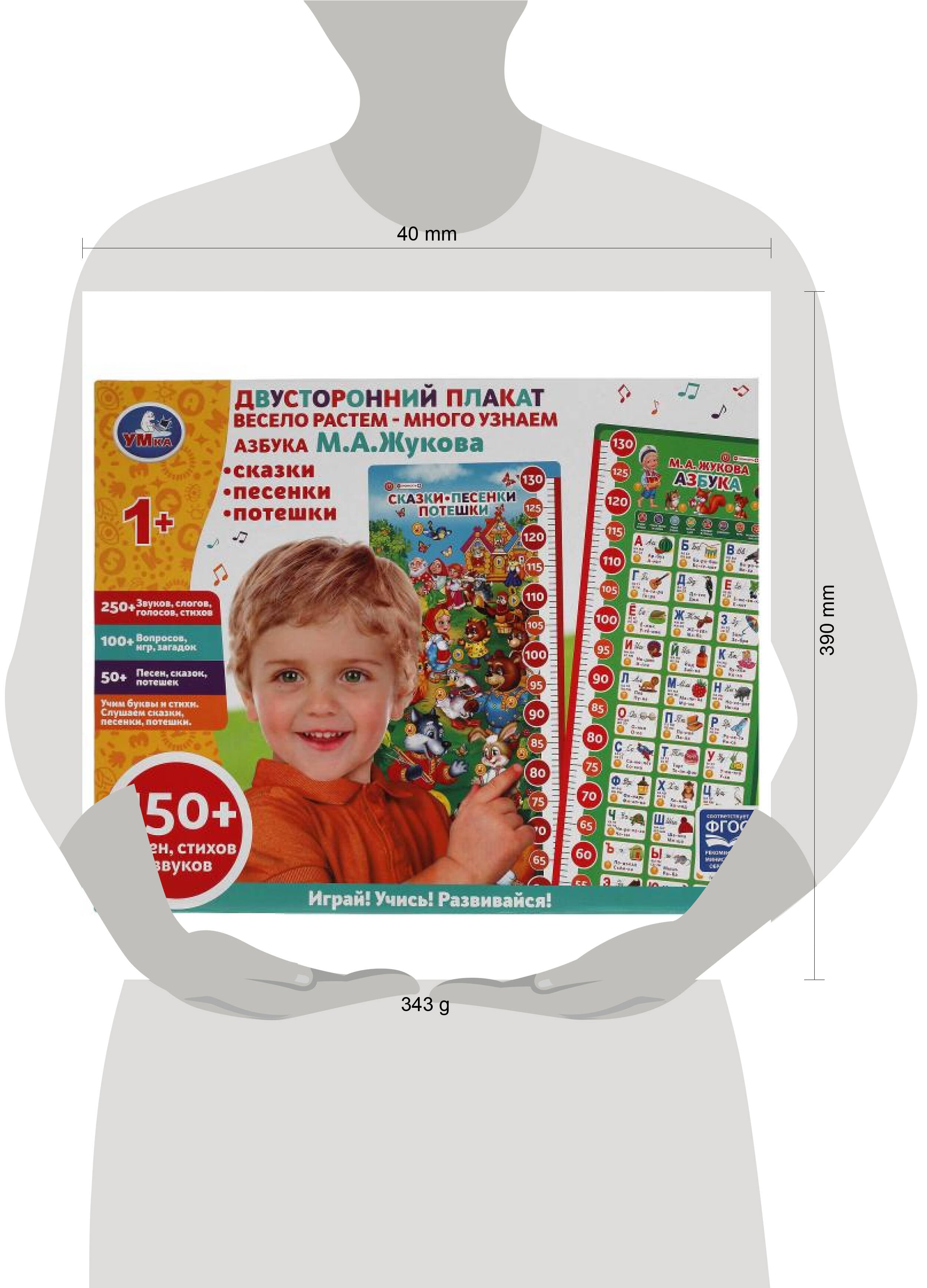 Обучающий двусторонний плакат "Весело растём-много узнаём" с азбукой М. А. Жуковой и ростомером ТМ "Умка" - многофункциональный помощник малышу в познании окружающего мира: - 5 песен из м/ф: "АБВГДЕйка", "Песня Мышонка", "Чунга-Чанга", "Облака", "Улыбка" - 5 сказок: "Теремок", "Репка", "Курочка Ряба", "Три медведя", "Колобок" - 10 потешек: "Петушок-золотой гребешок", "Гуси-гуси га-га-га", "Мишка косолапый", "Баю баюшки баю", "Калинка-малинка", "Зайка серенький сидит", "Идёт лисичка по мосту" и др. - кнопка "Вкл./Выкл." - регулировка громкости - соответствует ФГОС С помощью плаката ребёнок познакомится с буквами, а так же весело проведёт время слушая любимые песни из мультфильма, увлекательные сказки и весёлые народные потешки. Малыш легко научится управляться с плакатом самостоятельно. Обучение превратится в интересную игру. Обучающий плакат ТМ "Умка" поможет развить ребёнку: - слуховое восприятие - визуальное восприятие - память - тактильные навыки - моторику - координацию движений - логику Размер: 35 x 29 x 3 см. Материал: пластмасса + металл. Работает от 3-х батареек типа ААА (не входят в комплект). Рекомендовано детям от 3-х лет.| Издательство | СИМБАТ ООО |