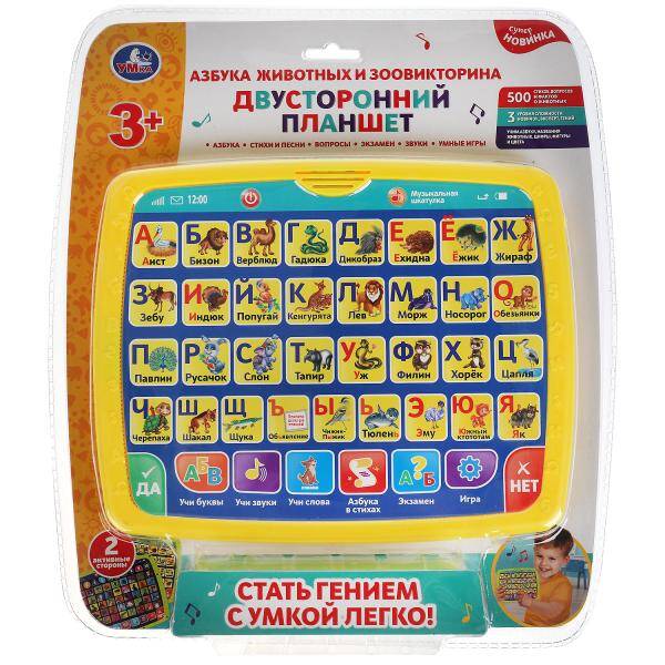 Обучающий двусторонний планшет "Азбука животных и зоовикторина" ТМ "УМка" станет прекрасным подарком для малыша: - две активные стороны - 3 песни: "АБВГДейка", "Облака", "Это знает всякий" - 500 стихов, вопросов и фактов о животных - 3 уровня сложности: "новичок", "эксперт", "гений" - учим азбуку, названия животных, цифры, фигуры и цвета. Игрушка-планшет - креативный и полезный подарок для развития и игры. Такой планшет поможет ребёнку быстро и эффективно выучить азбуку, цифры, фигуры, цвета и названия животных. Малыш с удовольствием будет нажимать на кнопки, слушать песни, играть и учиться. Обучающий планшет ТМ "УМка" способствует расширению кругозора и развивает: - звуковое восприятие и музыкальный слух - память - мелкую моторику - фантазию - речь Размер: 25 х 19 х 3 см. Материал: пластмасса. Работает от 3-х батареек типа АА. Рекомендовано детям от 3-х лет.| Издательство | С-Маркет ООО |