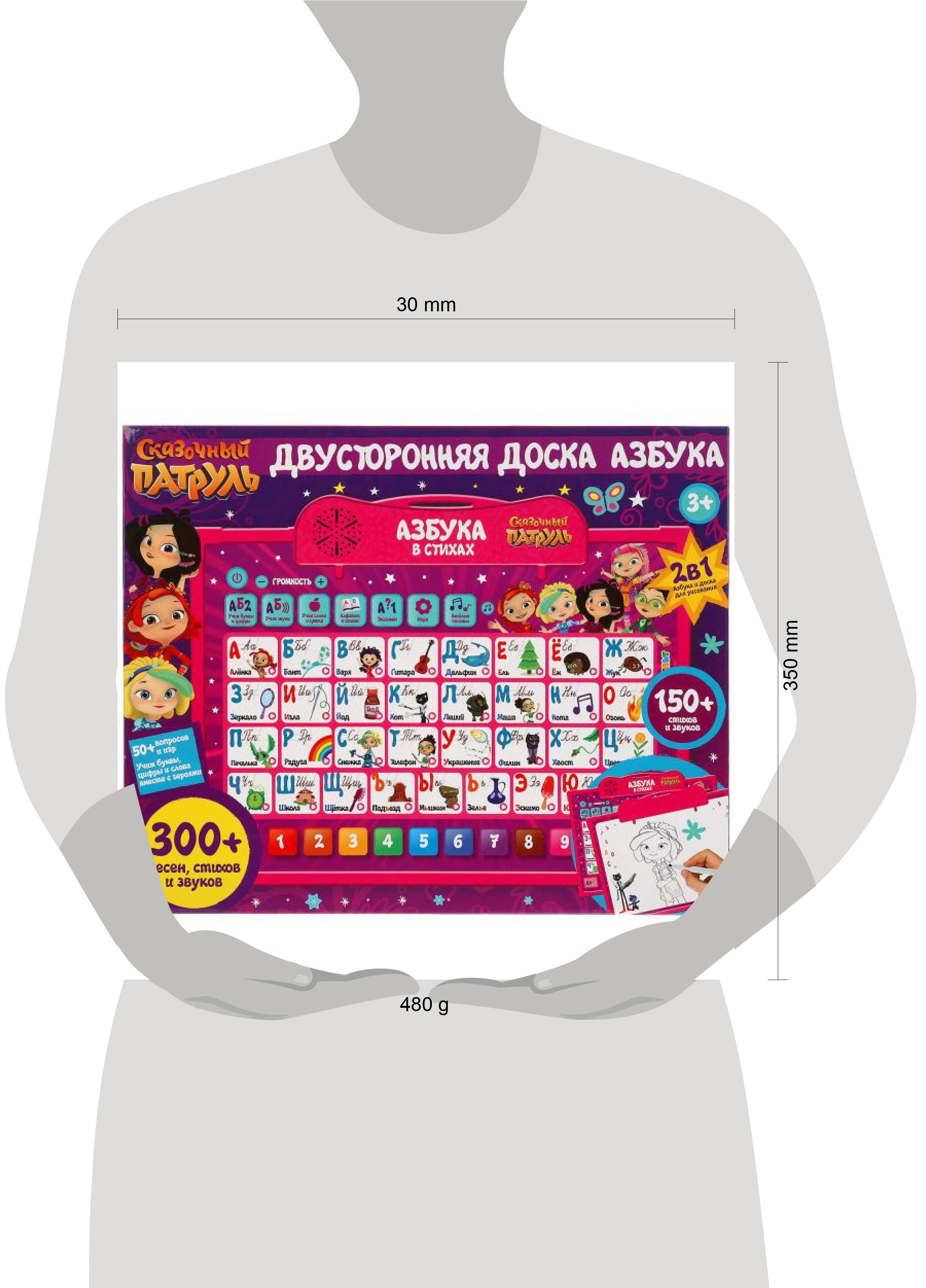 Двусторонняя доска "Сказочный патруль" ТМ "УМка" - непременно понравится маленьким поклонникам мультсериала о юных волшебницах: - 2 в 1: азбука и доска для рисования - 150 звуков и стихов - 50 вопросов и игр - 5 песен из м/ф (фрагменты): "Знакомство", "Поверь в себя", "Город Мышкин", "Заставка", "Отражает небо" - учим буквы, цифры и слова вместе с героями - кнопка "Вкл./Выкл." - кнопка регулировка громкости С помощью этой красочной и функциональной доски ребёнок сможет в лёгкой игровой форме выучить азбуку и освоить первые азы счёта. Кроме того, он поиграет в занимательные игры и послушает песенки из любимого мультфильма. Маленький любознайка также может перевернуть доску и порисовать на специальном поле. С такой интересной игрушкой обучение превратится в увлекательное и познавательное времяпровождение. Занятия с двусторонней доской ТМ "УМка" помогут развить: - слуховое восприятие и визуальное восприятие - память - тактильные навыки - творческое мышление - моторику - координацию движений - логику Размер: 35 х 29 х 3 см. Материал: пластмасса. Работает от 3-х батареек типа ААА (не входят в комплект). Рекомендовано детям от 3-х лет.| Издательство | СИМБАТ ООО |
