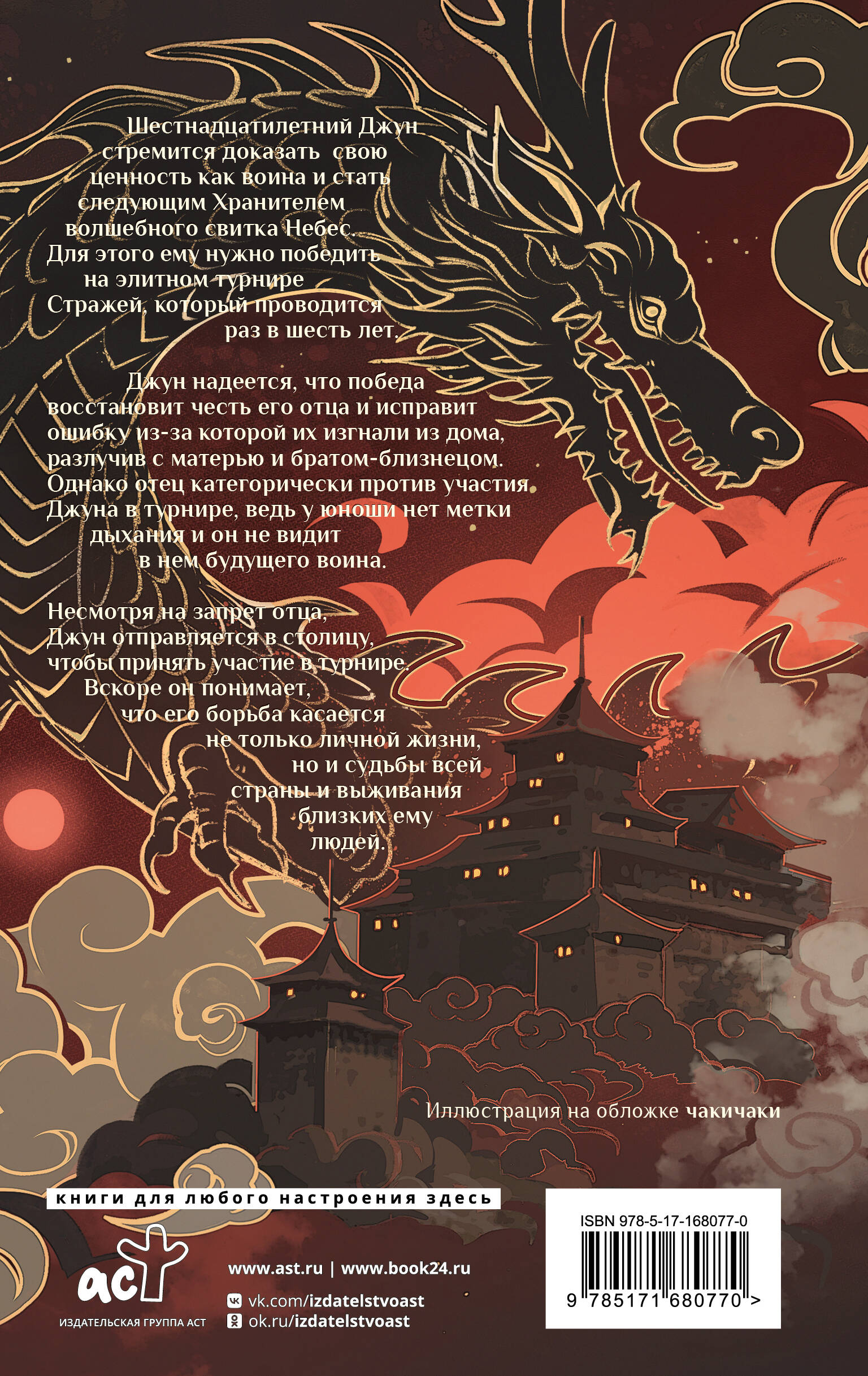 Шестнадцатилетний Джун стремится доказать свою ценность как воина и стать следующим Хранителем волшебного свитка Небес. Для этого ему нужно победить на элитном турнире Стражей, который проводится раз в шесть лет. Джун надеется, что победа восстановит честь его отца и исправит ошибку, из-за которой их изгнали из дома, разлучив с матерью и братом-близнецом. Однако отец категорически против участия Джуна в турнире, ведь у юноши нет метки дыхания и он не видит в нем будущего воина. Несмотря на запрет отца, Джун отправляется в столицу, чтобы принять участие в турнире. Вскоре он понимает, что его борьба касается не только личной жизни, но и судьбы всей страны и выживания близких ему людей.| Издательство | Издательство "АСТ" |