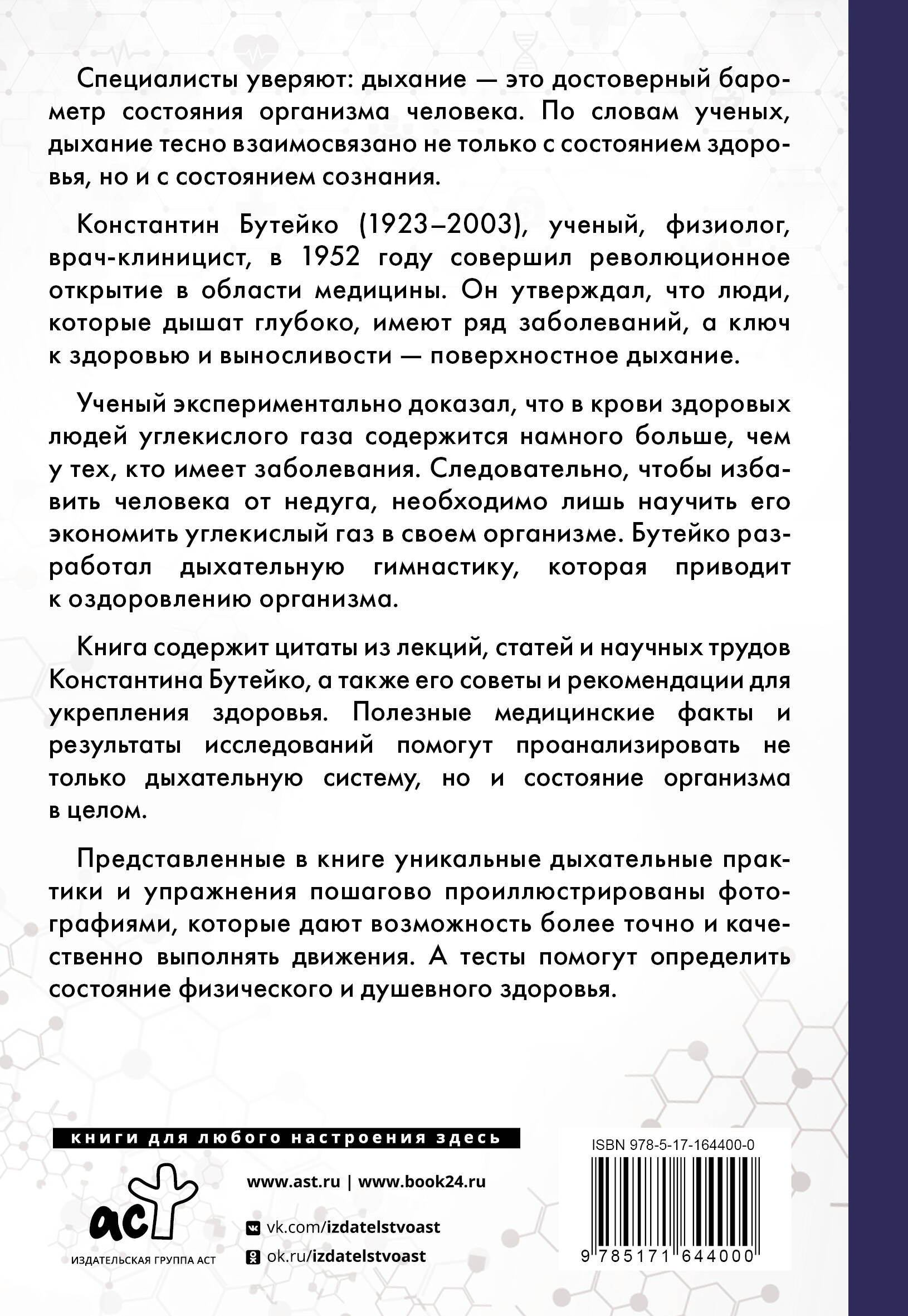 Специалисты уверяют: дыхание - это достоверный барометр состояния организма человека. По словам ученых, дыхание тесно взаимосвязано не только с состоянием здоровья, но и с состоянием сознания. Константин Бутейко (1923-2003), ученый, физиолог, врач-клиницист, в 1952 году совершил революционное открытие в области медицины. Он утверждал, что люди, которые дышат глубоко, имеют ряд заболеваний, а ключ к здоровью и выносливости - поверхностное дыхание. Ученый экспериментально доказал, что в крови здоровых людей углекислого газа содержится намного больше, чем у тех, кто имеет заболевания. Следовательно, чтобы избавить человека от недуга, необходимо лишь научить его экономить углекислый газ в своем организме. Бутейко разработал дыхательную гимнастику, которая приводит к оздоровлению организма. Книга содержит цитаты из лекций, статей и научных трудов Константина Бутейко, а также его советы и рекомендации для укрепления здоровья. Полезные медицинские факты и результаты исследований помогут проанализировать не только дыхательную систему, но и состояние организма в целом. Представленные в книге уникальные дыхательные практики и упражнения пошагово проиллюстрированы фотографиями, которые дают возможность более точно и качественно выполнять движения. А тесты помогут определить состояние физического и душевного здоровья.| Издательство | Издательство "АСТ" |