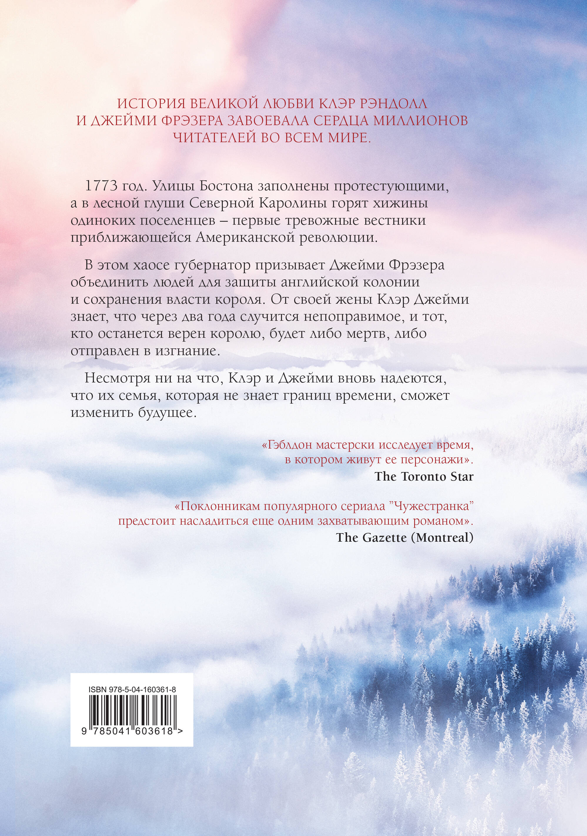 1773 год. Улицы Бостона заполнены протестующими, а в лесной глуши Северной Каролины горят хижины одиноких поселенцев - первые тревожные вестники приближающейся Американской революции. В этом хаосе губернатор призывает Джейми Фрэзера объединить людей для защиты английской колонии и сохранения власти короля. От своей жены Клэр Джейми знает, что через два года случится непоправимое, и тот, кто останется верен королю, будет либо мертв, либо отправлен в изгнание. Несмотря ни на что, Клэр с Джейми вновь надеются, что их семья, которая не знает границ времени, сможет изменить будущее. «Гэблдон мастерски исследует время, в котором живут ее персонажи». - The Toronto Star «Поклонникам популярного сериала "Чужестранка" предстоит насладиться еще одним захватывающим романом». - The Gazette (Montreal)