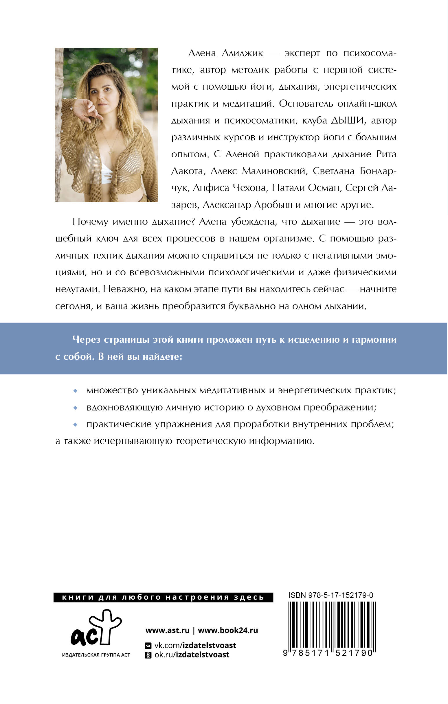 Алена Алиджик - эксперт по психосоматике, автор методик работы с нервной системой с помощью йоги, дыхания, энергетических практик и медитаций. Основатель онлайн-школ дыхания и психосоматики, клуба ДЫШИ, автор различных курсов и инструктор йоги с большим опытом. С Аленой практиковали дыхание Рита Дакота, Алекс Малиновский, Светлана Бондарчук, Анфиса Чехова, Натали Осман, Сергей Лазарев, Александр Дробыш и многие другие. Почему именно дыхание? Алена убеждена, что дыхание - это волшебный ключ для всех процессов в нашем организме. С помощью различных техник дыхания можно справиться не только с негативными эмоциями, но и со всевозможными психологическими и даже физическими недугами. Неважно, на каком этапе пути вы находитесь сейчас - начните сегодня, и ваша жизнь преобразится буквально на одном дыхании. Через страницы этой книги проложен путь к исцелению и гармонии с собой. В ней вы найдете: • множество уникальных медитативных и энергетических практик; • вдохновляющую личную историю о духовном преображении; • практические упражнения для проработки внутренних проблем; а также исчерпывающую теоретическую информацию.| Издательство | ИЗДАТЕЛЬСТВО "АСТ" |