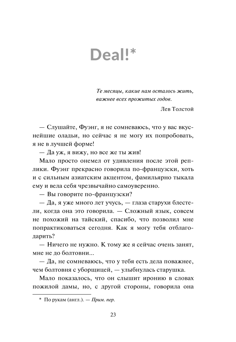Мало, двадцативосьмилетнего талантливого бизнес-стратега, командируют в Бангкок, чтобы он спас компанию, находящуюся на грани банкротства. Через несколько недель после приезда он случайно слышит разговор, который повергает его в шок: жить ему осталось совсем немного... Мод Анкауа, автор бестселлера «Нулевой километр», написала второй роман, полный мудрости, человечности и оптимизма. Эта книга предлагает читателю отправиться в путешествие к самому себе, открыть в сердце истинный смысл жизни. Она призывает нас черпать силу в прошлом - силу, которая поможет преодолеть страхи и жить той жизнью, которая нас вдохновляет.