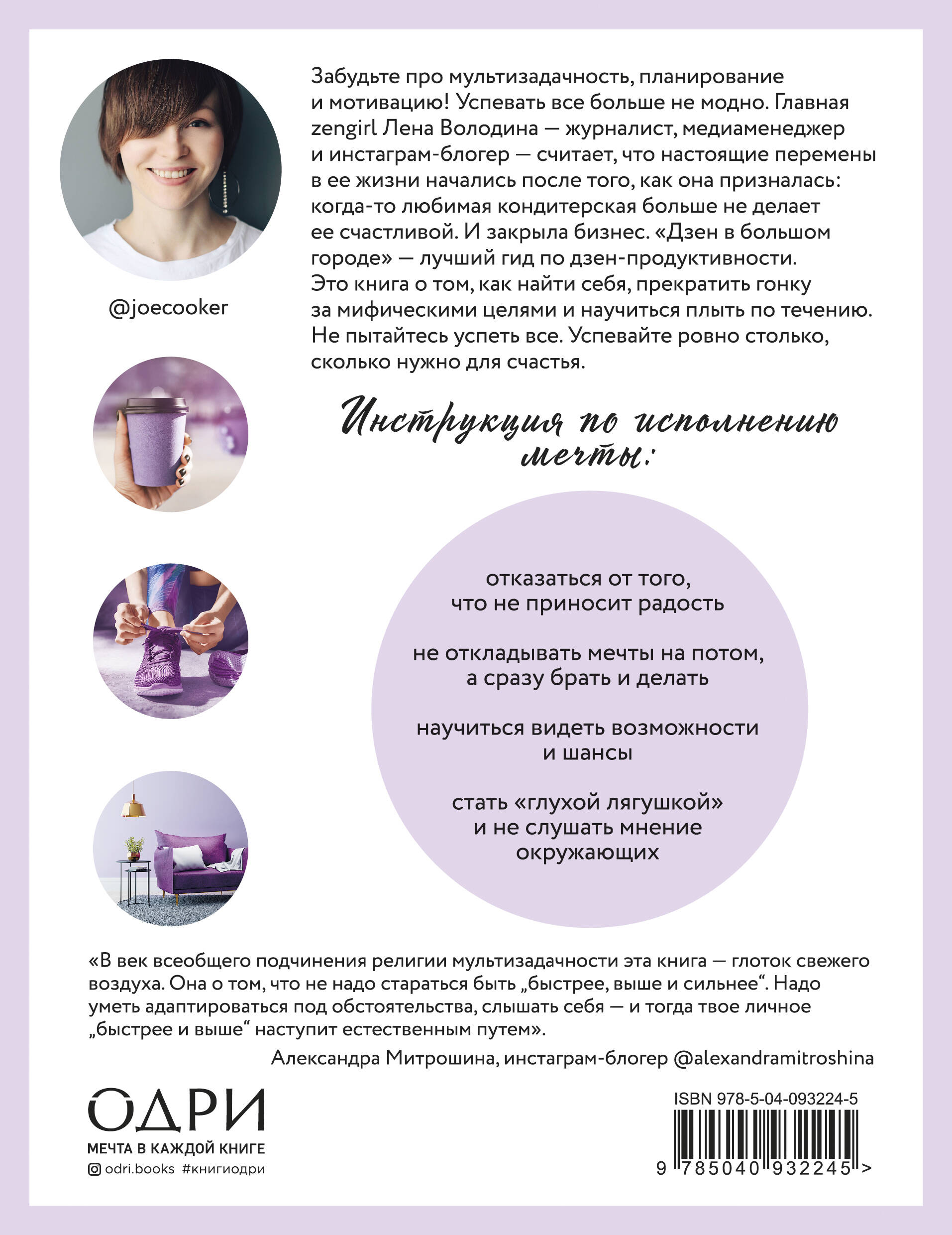 Забудьте про мультизадачность, планирование и мотивацию! Успевать все больше не модно. Главная zengirl Лена Володина - журналист, медиаменеджер и инстаграм-блогер (@joecooker), считает, что настоящие перемены в ее жизни начались после того, как она призналась: когда-то любимая кондитерская больше не делает ее счастливой. И закрыла бизнес. "Дзен в большом городе" - лучший гид по дзен-продуктивности. Это книга о том, как найти себя, прекратить гонку за мифическими целями и научиться плыть по течению. Не пытайтесь успеть все. Успевайте ровно столько, сколько нужно для счастья.