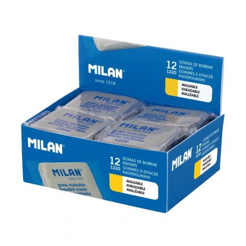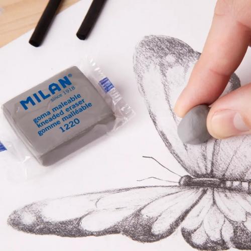Mīcama nevulkanizēta sintētiskā kaučuka dzēšgumija ar spēcīgu uzsūkšanas spēju. Piemērota tēlotājmākslas un ogles, pasteļa un grafīta zīmējumiem. Tīra dzēšana bez skaidām (bez putekļiem). Iepakota individuāli. Lietošanas instrukcija: atlasiet dzēšgumijas daļu un atdaliet to no pārējās, veidojot nelielu masu. Ar maigu spiedienu uzklājiet uz dzēšamās līnijas. 12 vienības kastē. Dzēšgumijas izmēri: 3,7 x 2,8 x 1 cm. MILAN dzēšgumijas tiek ražotas Spānijā kopš 1918. gada.