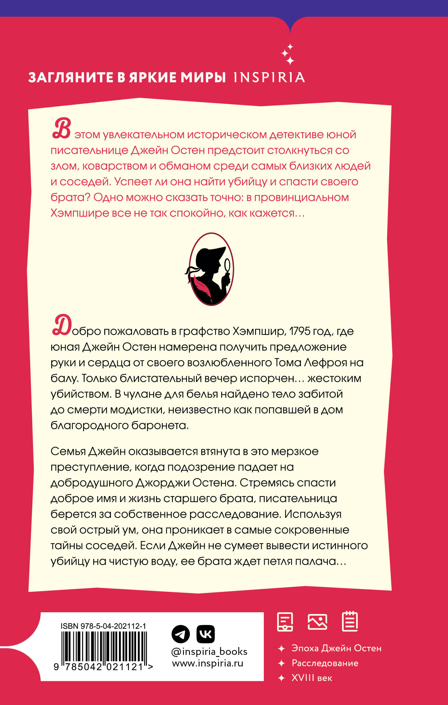 ОСТРОУМНЫЙ ДЕТЕКТИВ С ДЖЕЙН ОСТЕН В РОЛИ ПРОНИЦАТЕЛЬНОГО И НАХОДЧИВОГО СЫЩИКА. ИДЕАЛЬНО ДЛЯ ПОКЛОННИКОВ РИЧАРДА ОСМАНА И ДЖЕНИС ХАЛЛЕТТ. В этом увлекательном историческом детективе юной писательнице Джейн Остен предстоит столкнуться со злом, коварством и обманом среди самых близких людей и соседей. Успеет ли она найти убийцу и спасти своего брата? Одно можно сказать точно - в провинциальном Хэмпшире все не так спокойно, как кажется… Добро пожаловать в графство Хэмпшир, 1795 год, где юная Джейн Остен намерена получить предложение руки и сердца от своего возлюбленного Тома Лефроя на балу. Только блистательный вечер испорчен… жестоким убийством. В чулане для белья найдено тело забитой до смерти модистки, неизвестно как попавшей в дом благородного баронета. Семья Джейн оказывается втянута в это мерзкое преступление, когда подозрение падает на добродушного Джорджи Остена. Стремясь спасти доброе имя и жизнь старшего брата, писательница берется за собственное расследование. Используя свой острый ум, она проникает в самые сокровенные тайны соседей. Если Джейн не сумеет вывести истинного убийцу на чистую воду, ее брата ждет петля палача… _________________________________________________________ «Джессика Булл сочетает благородную сельскую жизнь георгианской эпохи с живой интригой детектива, создавая очень приятное чтение». - Sunday Express «Читать эту книгу было сплошным удовольствием. Я погрузилась в мир Джейн Остен, а с остроумной героиней Джессики Булл так интересно проводить время! По-настоящему увлекательно, атмосферно и восхитительно одновременно. Перевернув последнюю страницу, я уже скучала по Джейн и теперь не могу дождаться продолжения». - Кристин Перрин, автор мирового бестселлера «Руководство по раскрытию собственного убийства» «Уютный детектив "Джейн Остен расследует убийство", окутанный искрометной наблюдательностью и остроумием Джейн Остен, оживляет юную Джейн, пытающуюся раскрыть сельское убийство, произошедшее слишком близко к дому. Благодаря запоминающимся деталям и потрясающей исторической точности писательница Джессика Булл в своем удивительно уверенном и увлекательном дебюте знакомит читателя с историей семьи Остен в Стивентоне. Сочетая неистовую энергию фильма "Джейн Остен" с запутанными сюжетными головоломками Ф. Д. Джеймс, "Джейн Остен расследует убийство" дает поклонникам Остен замечательный новый способ оценить своего любимого автора». - Натали Дженнер, автор бестселлера «Общество Джейн Остен» «Богатая фантазия и прекрасный сюжет - отличное чтение». - Си Джей Беннет, автор бестселлера «Виндзорский узел» «Блестящий дебют». - Woman & Home «Это увлекательное чтение - настоящий глоток свежего воздуха!» - Fabulous, Sun «Замечательная детективная загадка, в которой много остроумия и сопереживания, как в романах Остен». - Red «Восхитительно». - Crime Monthly «Так умно и хорошо написано». - Good Housekeeping «Сверкающий… Блестящий дебют, который делает честь Джейн». - Woman's Weekly «Исключительный - детектив про Остен, которого я, кажется, желала всю жизнь! Исторические детали были богатыми и безупречными, с великолепно прорисованными персонажами, всеми перипетиями, которые вы ожидаете от детектива про убийства, и невероятно ярким голосом Остен. Мне это очень понравилось». - Софи Ирвин, автор серии книг «Советы юным леди» «Настоящий восторг. Захватывающая тайна уб