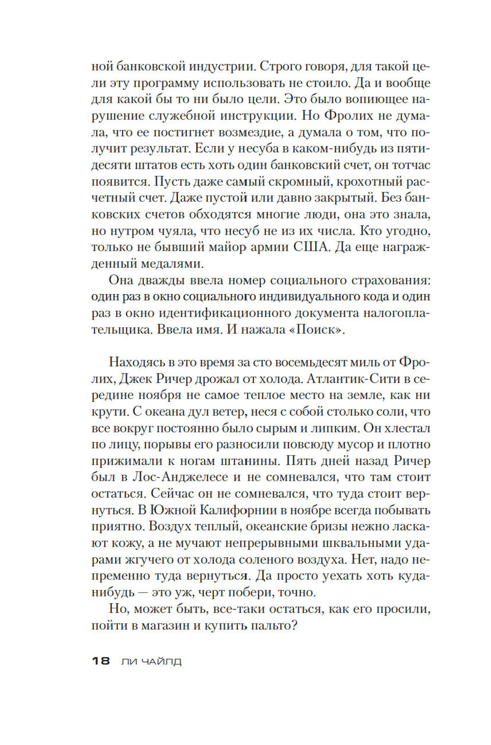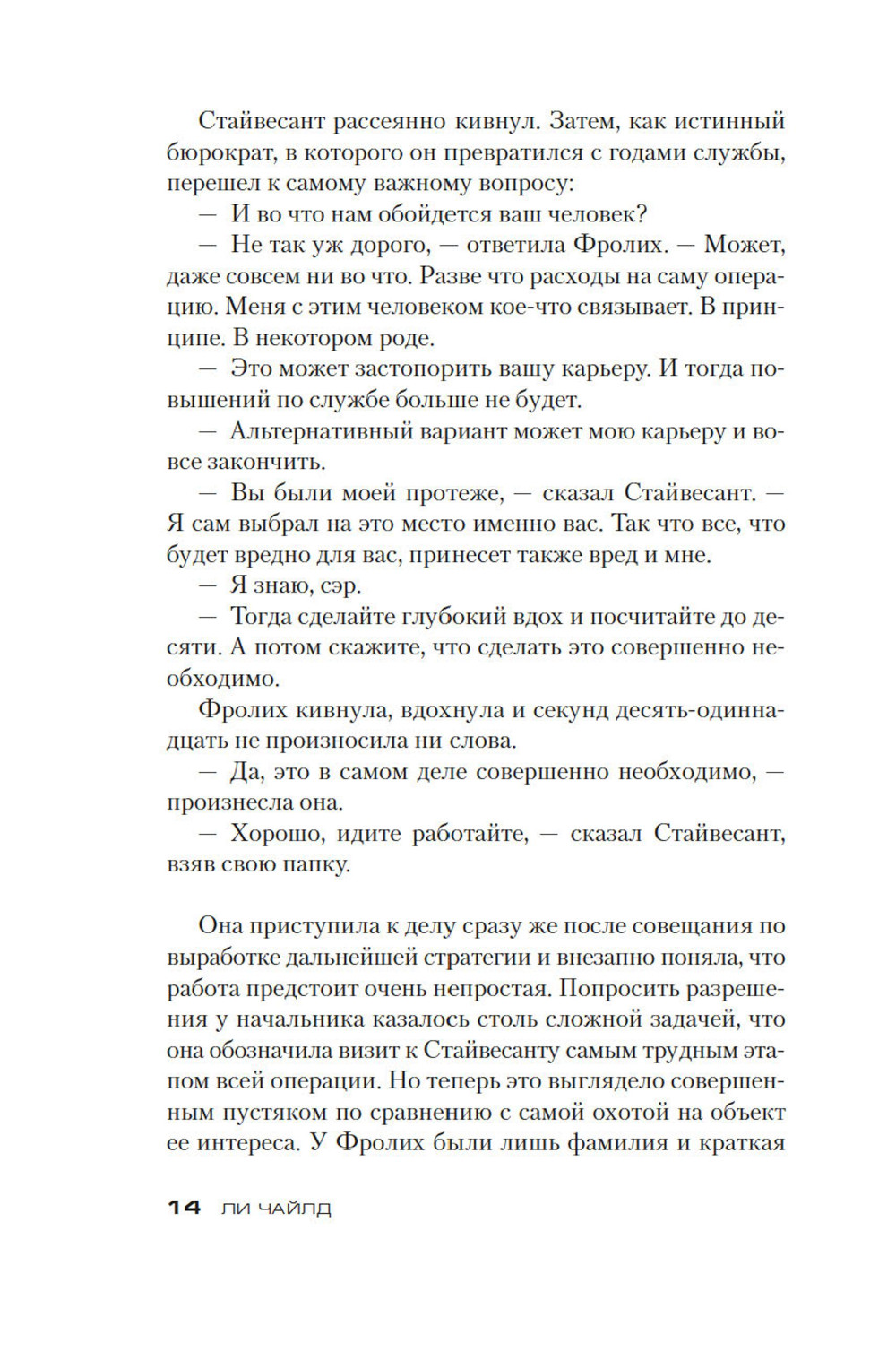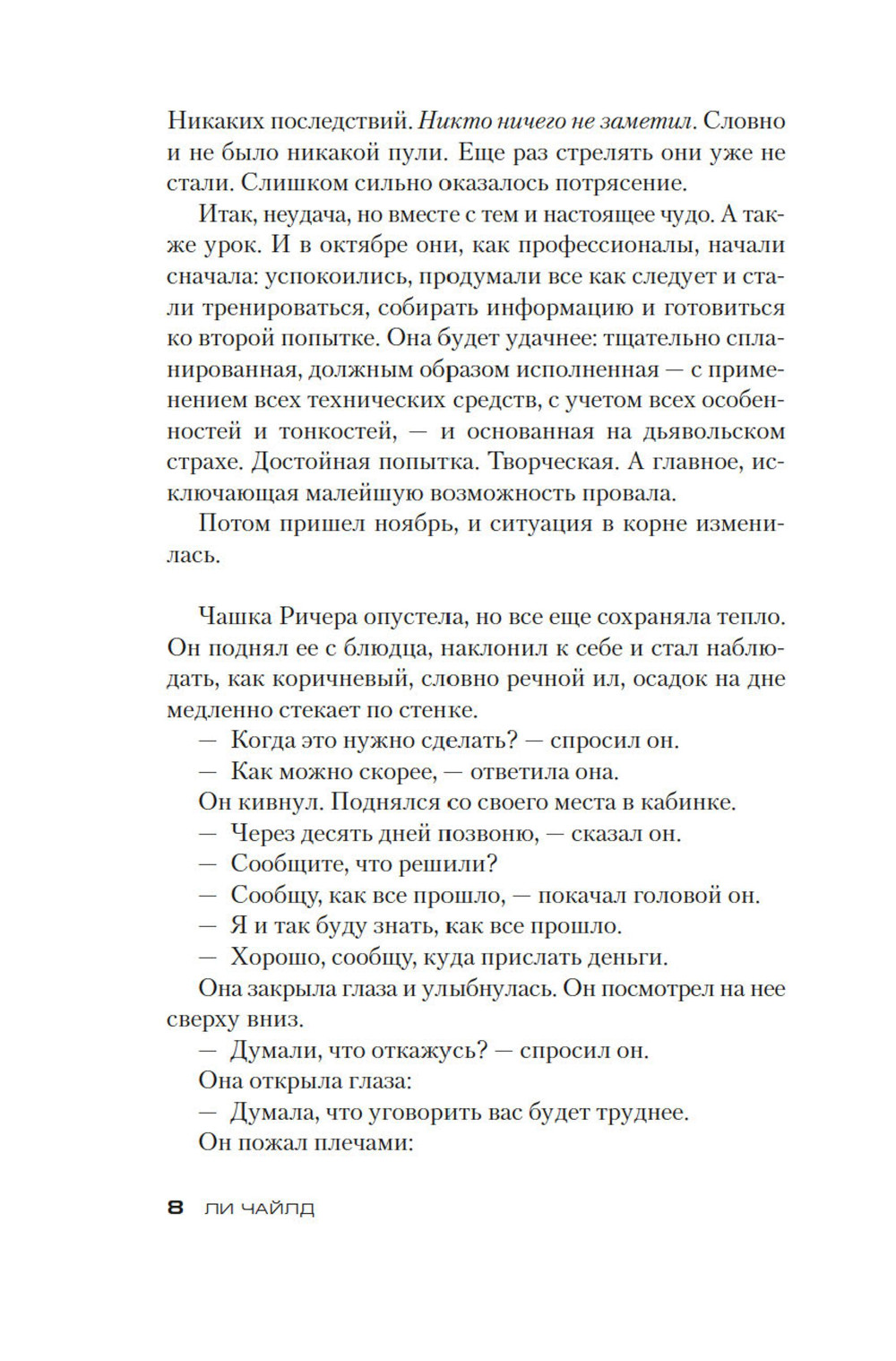 Джек Ричер, бывший военный полицейский, превыше всего ценит свою личную свободу. Доходы, налоги, недвижимость - все это не для него, да и длительные отношения с женщинами, по мнению Ричера, только обременяют человека. Другое дело, если дама обращается с просьбой о помощи, ведь чужие проблемы всегда решаются легче, чем собственные. Во всяком случае, Ричер до сих пор справлялся с этим превосходно. Вот и теперь он соглашается помочь одной милой девушке, - между прочим, она возглавляет спецгруппу охраны вице-президента Соединенных Штатов, которого взял на мушку тайный враг. Покушение четко спланировано, не учтен лишь один момент: в игру вмешался Джек Ричер, - и можно лишь посочувствовать тому, кто играет не по его правилам.| Издательство | Азбука |