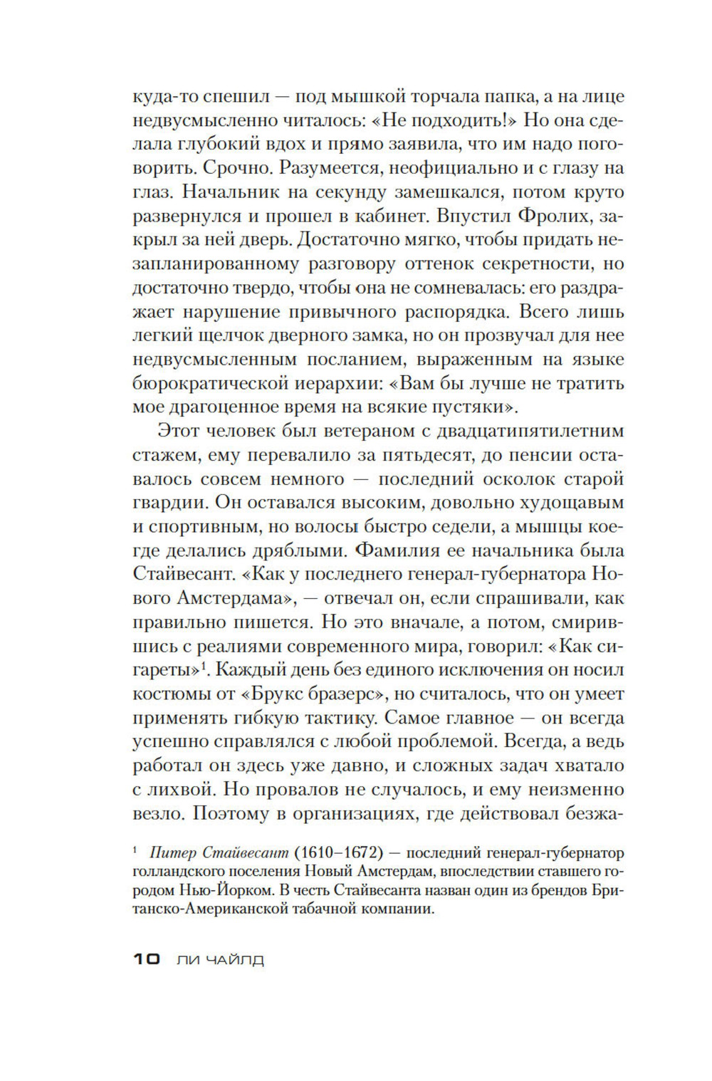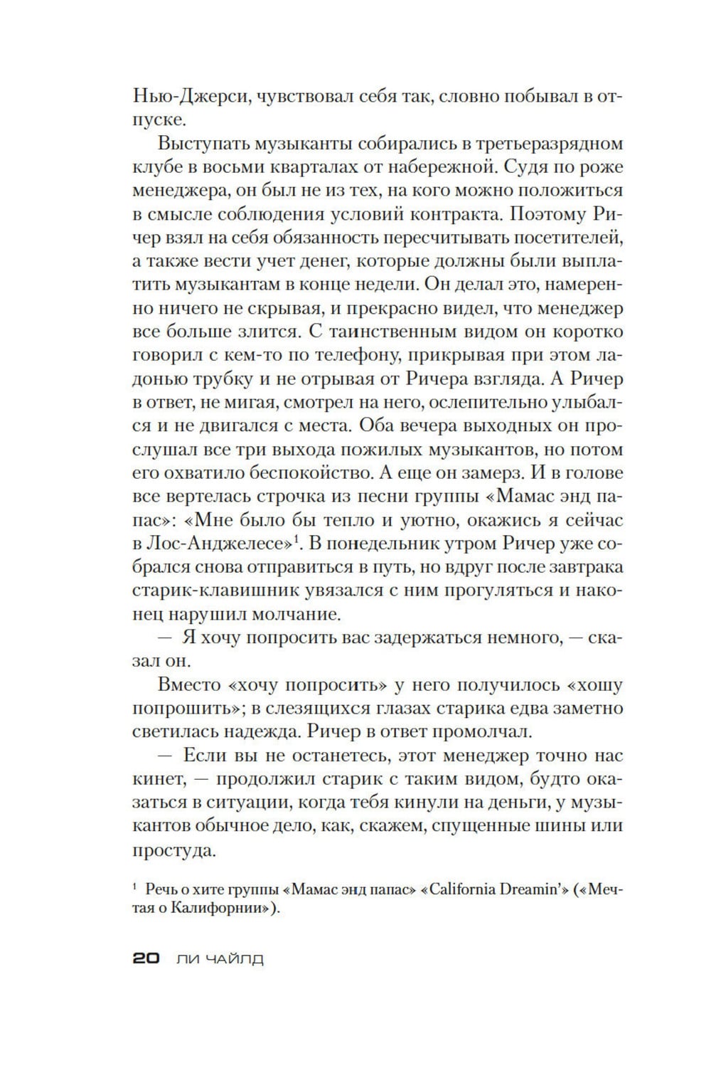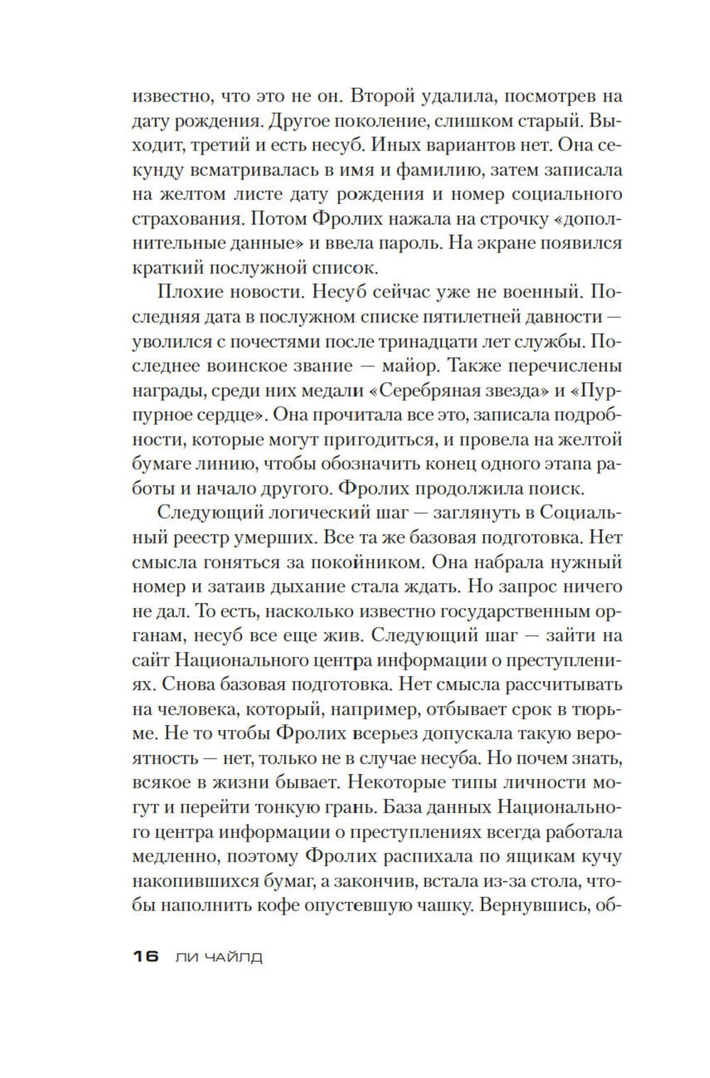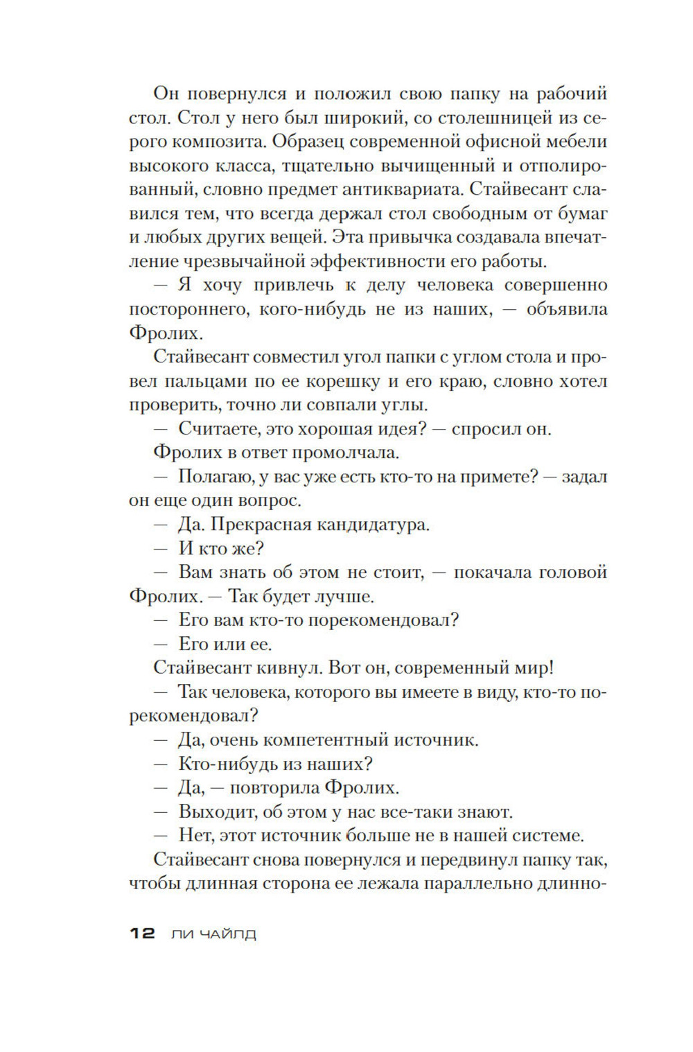 Джек Ричер, бывший военный полицейский, превыше всего ценит свою личную свободу. Доходы, налоги, недвижимость - все это не для него, да и длительные отношения с женщинами, по мнению Ричера, только обременяют человека. Другое дело, если дама обращается с просьбой о помощи, ведь чужие проблемы всегда решаются легче, чем собственные. Во всяком случае, Ричер до сих пор справлялся с этим превосходно. Вот и теперь он соглашается помочь одной милой девушке, - между прочим, она возглавляет спецгруппу охраны вице-президента Соединенных Штатов, которого взял на мушку тайный враг. Покушение четко спланировано, не учтен лишь один момент: в игру вмешался Джек Ричер, - и можно лишь посочувствовать тому, кто играет не по его правилам.| Издательство | Азбука |