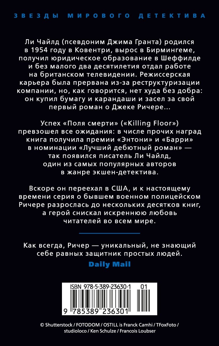 Автостоп - ненадежный способ передвижения. К тому же в такую жару ни один водитель не откроет дверь кабины настолько, чтобы вы успели забраться внутрь. Таковы выводы Джека Ричера, бывшего военного полицейского, который спешно покидает техасский городок из-за проблем с одним местным копом. Джеку без разницы, кто согласится подвезти его, лишь бы это было поскорее. К его полному изумлению, машина останавливается на раскаленной дороге через три минуты после того, как он проголосовал. Это личный рекорд Ричера. Тем более что за рулем роскошного «кадиллака» женщина - красивая, молодая и, судя по всему, богатая. Но обольщаться рано - ею движет вовсе не сердечная доброта и не внезапно вспыхнувшее влечение к незнакомцу. Кармен Грир угрожает опасность, и она рассчитывает на его помощь. Ее план звучит невероятно, если не сказать дико, но, во-первых, Ричеру в прямом смысле некуда деваться, а во-вторых, он никогда не мог устоять перед дамой, попавшей в беду. Рисковать ему не в диковинку, и если уж Джек Ричер не сможет все уладить, то кто тогда?..| Издательство | Азбука |