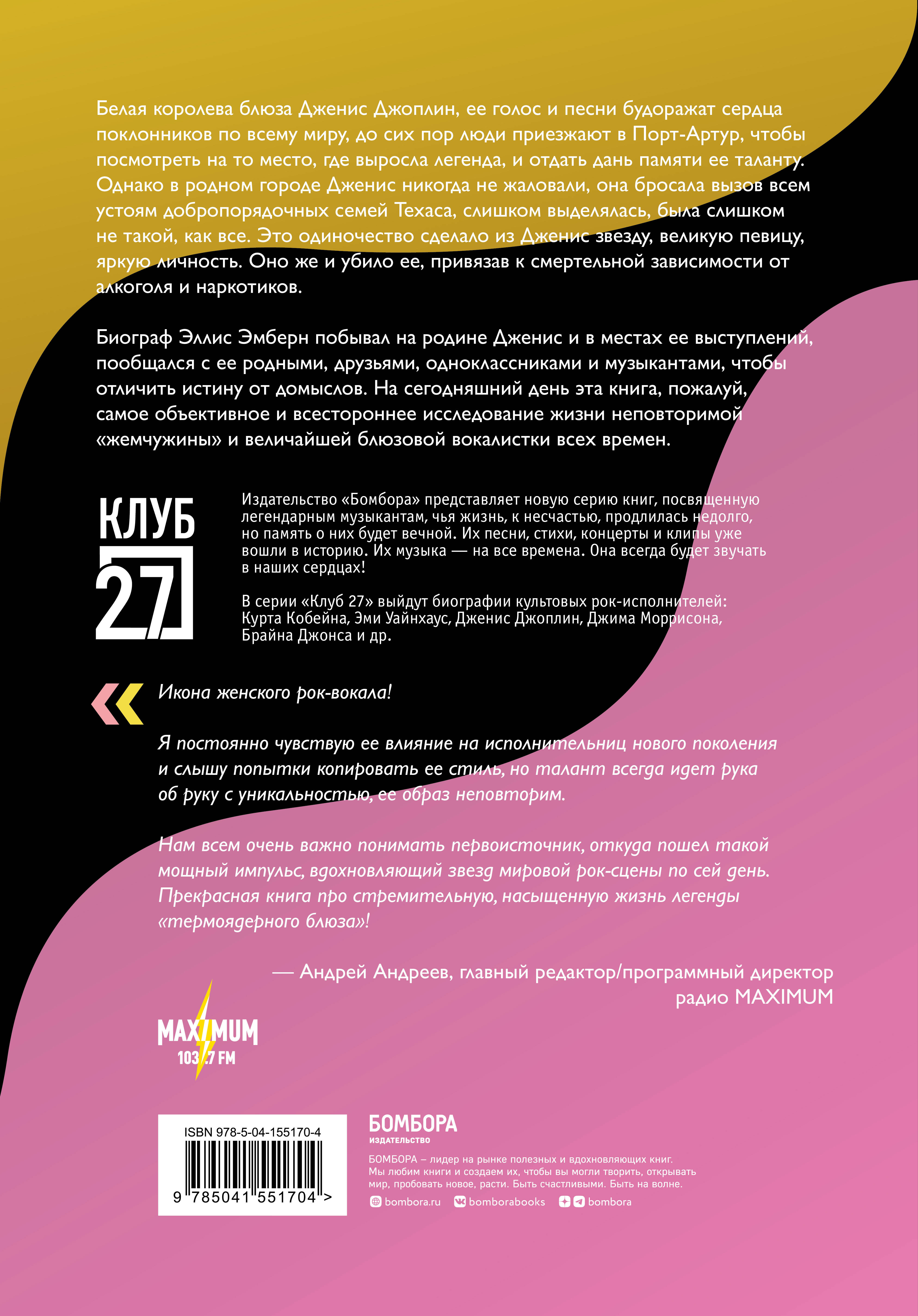 Белая королева блюза - Дженис Джоплин; ее голос и песни будоражат сердца поклонников по всему миру. Люди до сих пор приезжают в Порт-Артур, чтобы посмотреть на то место, где выросла легенда, и отдать дань памяти ее таланту. Однако в родном городе Дженис никогда не жаловали: она бросала вызов всем устоям добропорядочных семей Техаса, слишком выделялась, была совсем не такой, как все. Это одиночество сделало из Дженис звезду, великую певицу, яркую личность. Оно же и убило ее, привязав к смертельной зависимости от алкоголя и наркотиков. Биограф Эллис Эмберн побывал в Порт-Артуре и других значимых местах Дженис, он взял десятки интервью у ее родных, друзей, соседей, музыкантов, изучил материалы следствия и вскрытия, чтобы пролить истинный свет на ее безбашенную и трагичную жизнь и ее столь внезапную для всех смерть. Эта книга - всестороннее, объективное, но вместе с тем трепетное исследование истории «жемчужины». В России издание выходит при информационной поддержке фан-комьюнити Дженис Джоплин https://vk.com/club116056. «Икона женского рок-вокала! Я постоянно чувствую ее влияние на исполнительниц нового поколения и слышу попытки копировать ее стиль, но талант всегда идет рука об руку с уникальностью, ее образ неповторим. Нам всем очень важно понимать первоисточник, откуда пошел такой мощный импульс, вдохновляющий звезд мировой рок-сцены по сей день. Прекрасная книга про стремительную насыщенную жизнь легенды "термоядерного блюза"!» - Андрей Андреев, главный редактор/ программный директор радио MAXIMUM «Дженис Джоплин - фигура сложная и противоречивая. За прошедшие с момента ее гибели пять десятилетий в общественном сознании закрепилось несколько образов Джоплин. Для одних она - легендарная рок-звезда, "прожившая жизнь на полную" и сломавшая гендерные стереотипы. Кто-то воспринимает ее как не выдержавшую давления со стороны общества ранимую девушку, для которой разного рода излишества были лишь попыткой скрыть свои душевные травмы. Несмотря на довольно большое количество поклонников певицы в нашей стране, подробности биографии Джоплин известны немногим. Более того, о ее жизни курсирует множество мифов и небылиц. Уверен, что данная книга развеет некоторые из них и поможет намного лучше понять личность Джоплин всем, кому небезразлично ее творчество». - Ким Захаров, администратор группы https://vk.com/club116056, исследователь творчества Дженнис Джоплин и переводчик этой книги