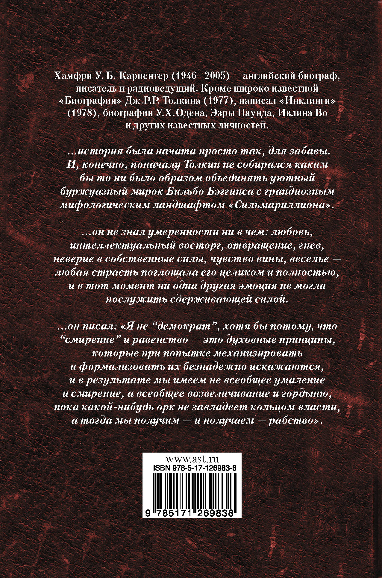 Хамфри У. Б. Карпентер (1946-2005) - английский биограф, писатель и радиоведущий. Кроме широко известной "Биографии" Дж.Р.Р.Толкина (1977), написал "Инклинги" (1978), биографии У.Х.Одена, Эзры Паунда, Ивлина Во и других известных личностей.| Издательство | Издательство "АСТ" |