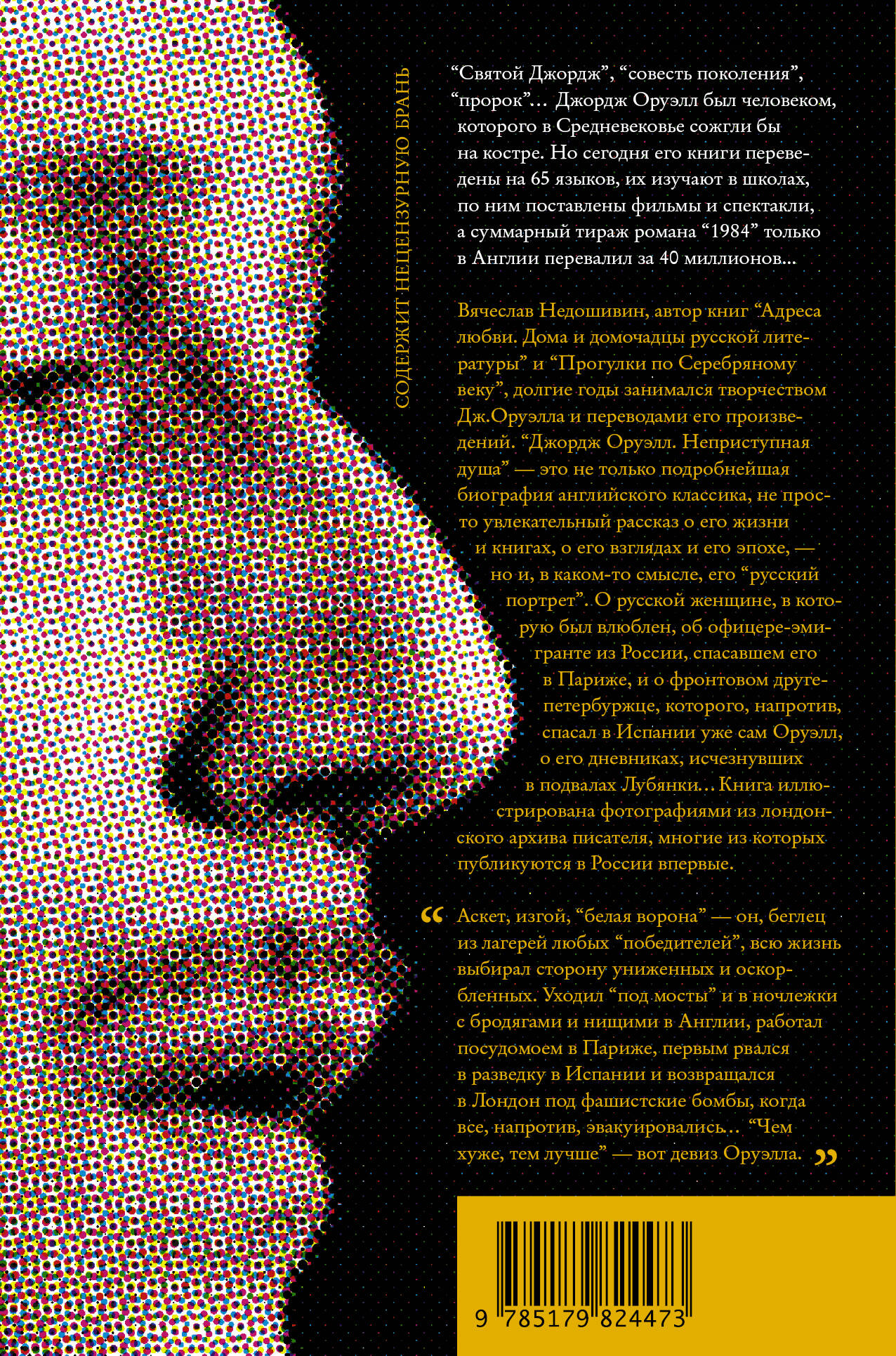 "Святой Джордж", "совесть поколения", "пророк"… Джордж Оруэлл был человеком, которого в Средневековье сожгли бы на костре. Но сейчас 20 томов его наследия изучают в школах, его книги переведены на 65 языков, по ним поставлены фильмы и спектакли, а суммарный тираж его романа "1984" только в Англии перевалил за 40 миллионов... 130 его предсказаний из 137 - уже сбылись, и это не предел. Вячеслав Недошивин - писатель, автор книг "Адреса любви. Дома и домочадцы русской литературы. Москва, Санкт-Петербург, Париж" и "Прогулки по Серебряному веку. Санкт-Петербург". Долгие годы - от диссертации об антиутопиях в 1985 году до статей в научных сборниках и журналах ("Иностранная литература") - занимался творчеством Дж. Оруэлла и переводами его произведений. "Джордж Оруэлл. Неприступная душа" - это не только подробнейшая биография английского классика, не просто увлекательный рассказ о его жизни и книгах, о его взглядах и его эпохе, - но и, в каком-то смысле, первый его "русский портрет". О русской женщине, в которую был влюблен, об офицере-эмигранте из России, спасавшем его в Париже, и о фронтовом друге-петербуржце, которого, напротив, спасал в Испании уже сам Оруэлл, о дневниках писателя, исчезнувших в подвалах Лубянки, и о переписке с СССР, которую обнародовали у нас лишь в девяностых… Книга иллюстрирована уникальными фотографиями из лондонского архива писателя, многие из которых публикуются в России впервые. "Аскет, изгой, "белая ворона" - он, беглец из лагерей любых "победителей", всю жизнь выбирал сторону униженных и оскорбленных, выбирал для себя не рай, но ад. Уходил "под мосты" и в ночлежки с бродягами и нищими в Англии, работал посудомоем в Париже, первым рвался в разведку в Испании и возвращался в Лондон под фашистские бомбы, когда все, напротив, эвакуировались. "Чем хуже, тем лучше" - вот девиз Оруэлла, если на карту ставилась жизнь".| Издательство | ИЗДАТЕЛЬСТВО "АСТ" |