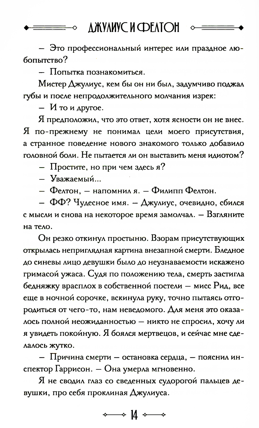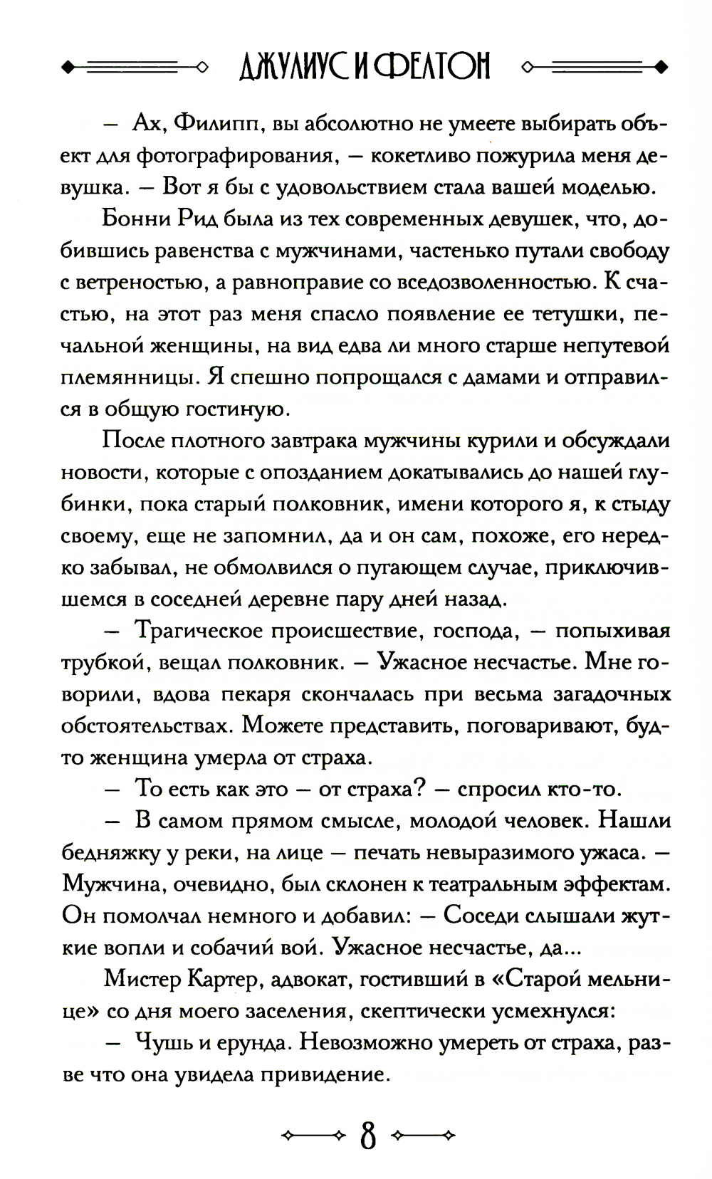Начало XX века. В городе Блэкпул открывается детективное агентство «Джулиус и Фелтон», куда обращаются те, кому не в силах помочь полиция. Сотрудников двое: журналист Филипп, который волею случая оказался втянут в расследование, и загадочный мистер Джулиус - непревзойденный знаток потустороннего мира, блестяще раскрывающий самые невероятные преступления. Компаньоны берутся только за необычные дела, связанные со сверхъестественным: мстительные призраки, смертоносные проклятия, восставшие мертвецы и таинственные убийства. Раз за разом они решают запутанные головоломки и сражаются со злом, спасая жизни, пока однажды кровавое преступление из прошлого не заставляет Фелтона задуматься: какие тайны скрывает его компаньон? И можно ли ему доверять?| Издательство | ИД КомпасГид |