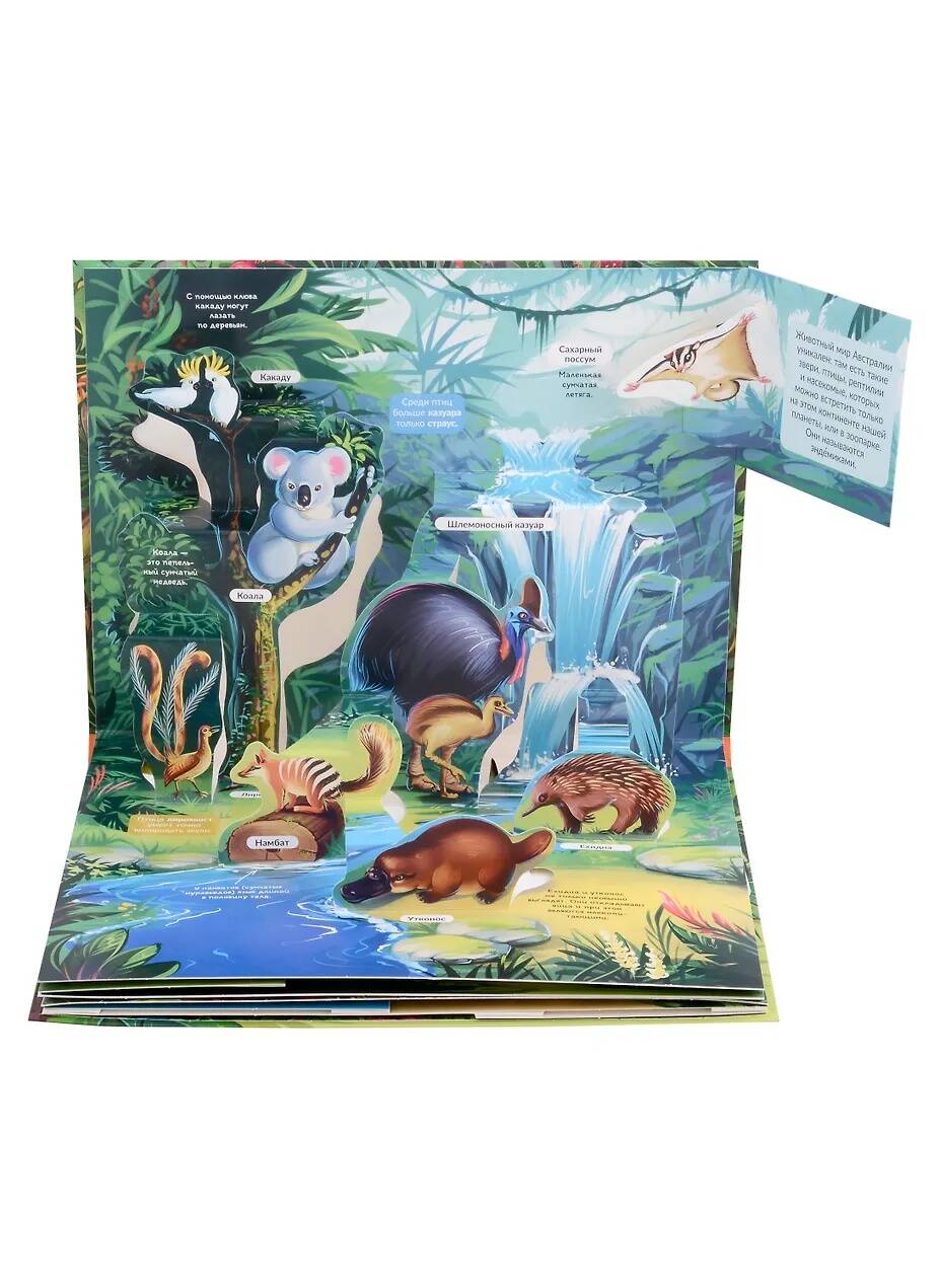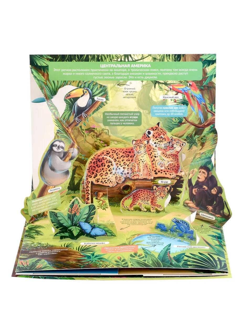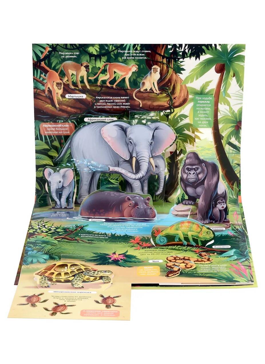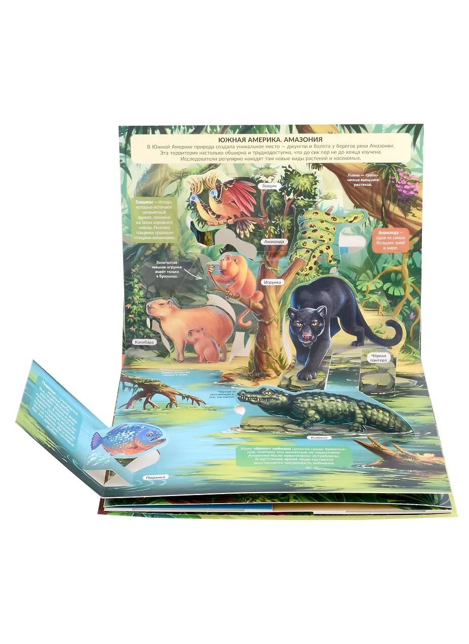 Яркая энциклопедия "Джунгли" в формате книжки-панорамки с невероятными объемными иллюстрациями. 3D развороты создают ощущение дополненной реальности и присутствия в настоящих джунглях. На каждом развороте есть откидной клапан-сюрприз, заглянув под который малыш увидит интересный факт или изображение. Наличие объемных и открывающихся элементов развивает мелкую моторику и пространственное мышление ребенка. Размер обложки: 26х20 см, 5 объемных разворотов. Порадуйте своего ребенка увлекательной энциклопедией-панорамкой с яркими, объемными иллюстрациями!| Издательство | Производитель сторонней продукции |