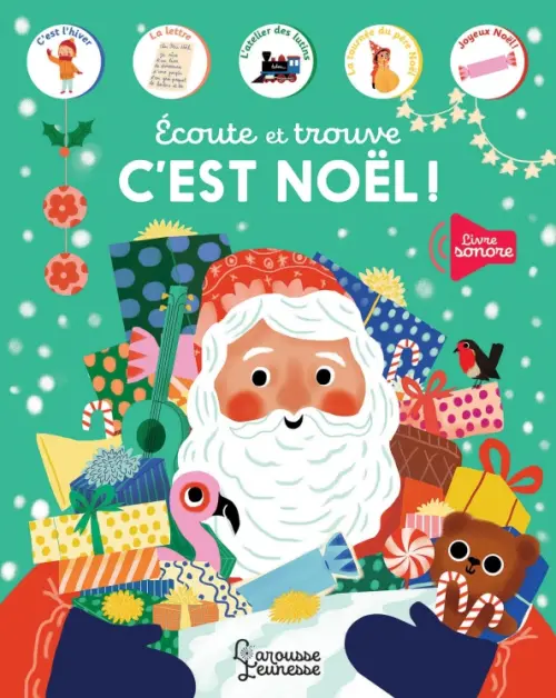 Un cherche et trouve, grand format, richement illustré avec 10 puces sonores pour écouter les petits bruits de noël (vent qui souffle, feu qui crépite, brouhaha dans l'atelier des lutins, clochettes du traineau qui tintent dans la nuit...) et de jolies mélodies (Mon beau sapin, Nous vous souhaitons un joyeux noël, Vive le vent ...)